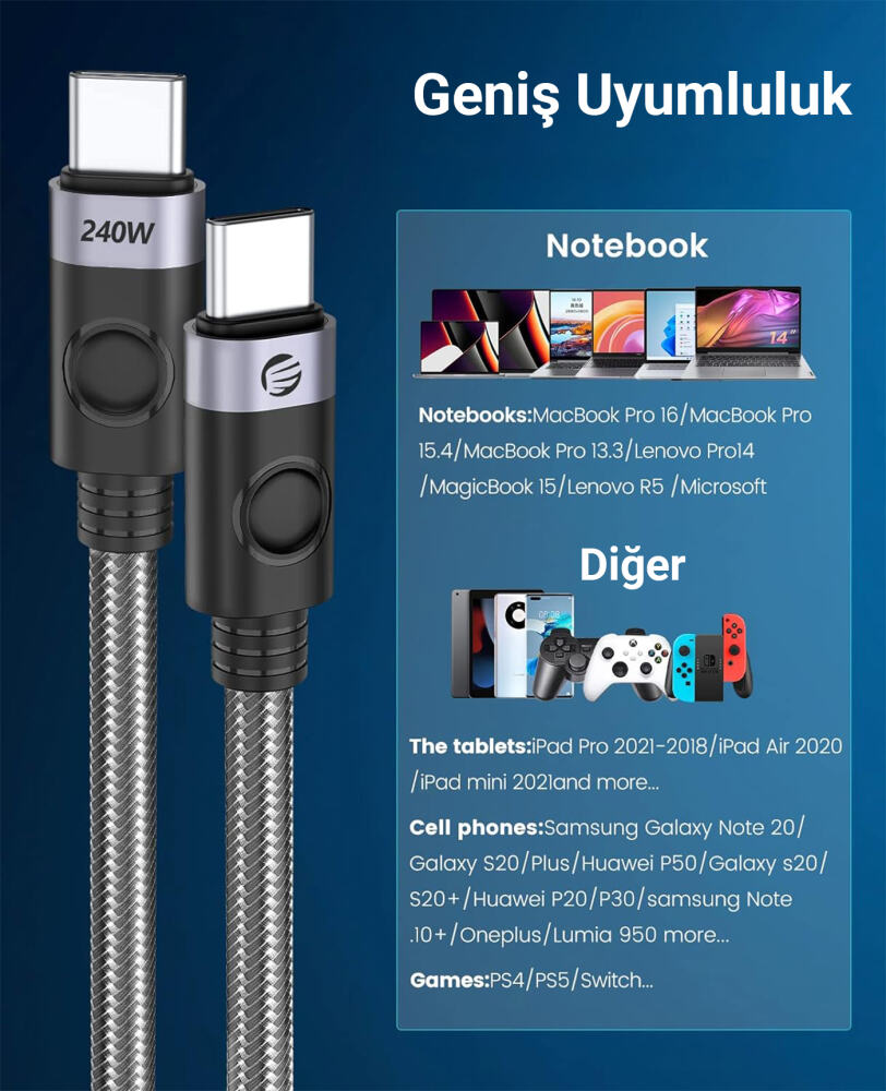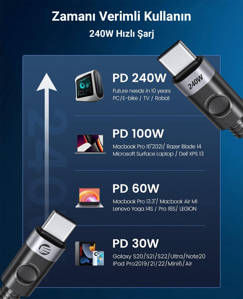 Orico 240W 5A PD USB-C to USB-C hızlı şarj ve data kablosu, dayanıklı örgülü tasarımıyla uzun ömürlü ve stabil performans sağlar. Bu kabloyla telefon, tablet, notebook gibi şarj giriş yuvası USB-C olan tüm cihazlarınızı uygun şarj cihazı kullanarak 240W a kadar hızlı ve güvenli bir şekilde şarj edebilirsiniz. 240W 5A desteği ile bir çok yüksek güç ile çalışan taşınabilir bilgisayarlarda dahi kullanım sağlayabilirsiniz. Aynı zamanda USB 2.0 ara yüzü sayesinde 480Mbps hızlarda veri aktarımı sağlayabilirsiniz.