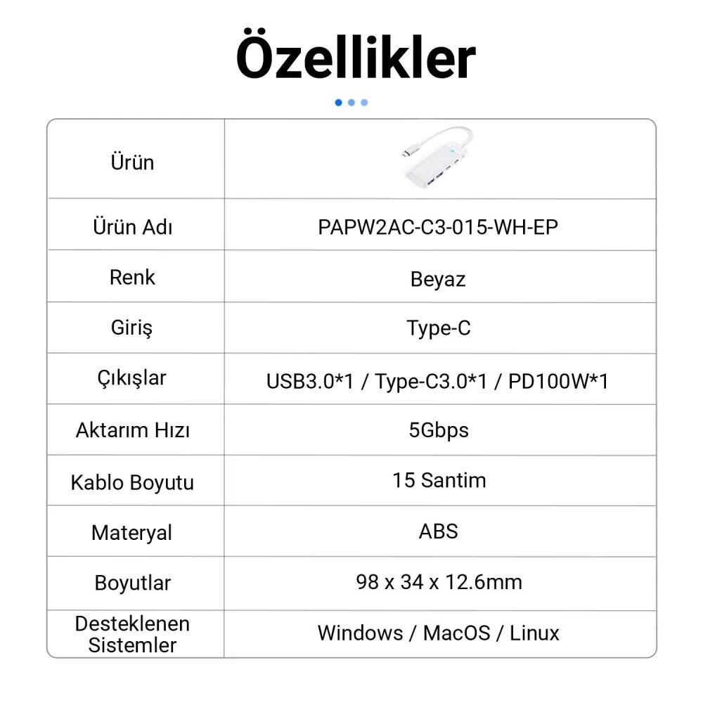 - 1 x Orico 4 Portlu Type-C to USB 3.0 / Type-C PD 100W Yüksek Hızlı 5Gbps HUB Çoklayıcı Beyaz