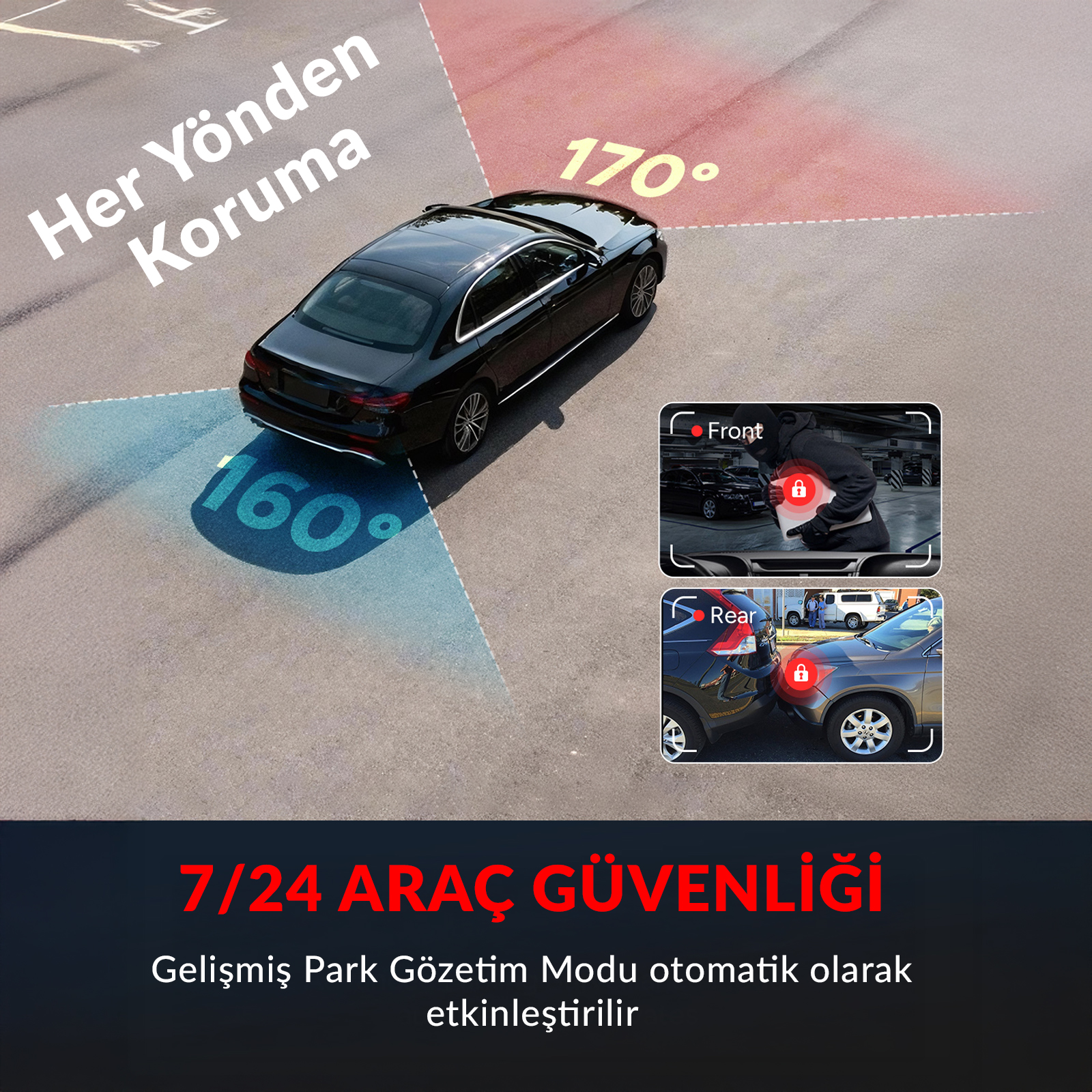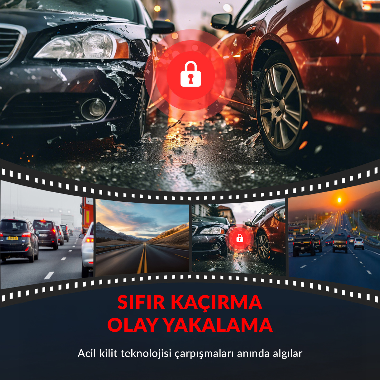 G-Sensör teknolojisi ile donatılmış bu araç kamerası, ani darbeleri ve çarpışmaları anında algılar. Çarpma anında kritik görüntüler otomatik olarak korunur ve üzerine yazılmaz. Otopark modundaki zaman atlamalı kayıt ve hareket algılama özellikleri sayesinde araç park halindeyken bile güvende kalır. Dashcam sistemi acil durum kayıt modunda olayları kaçırmaz.