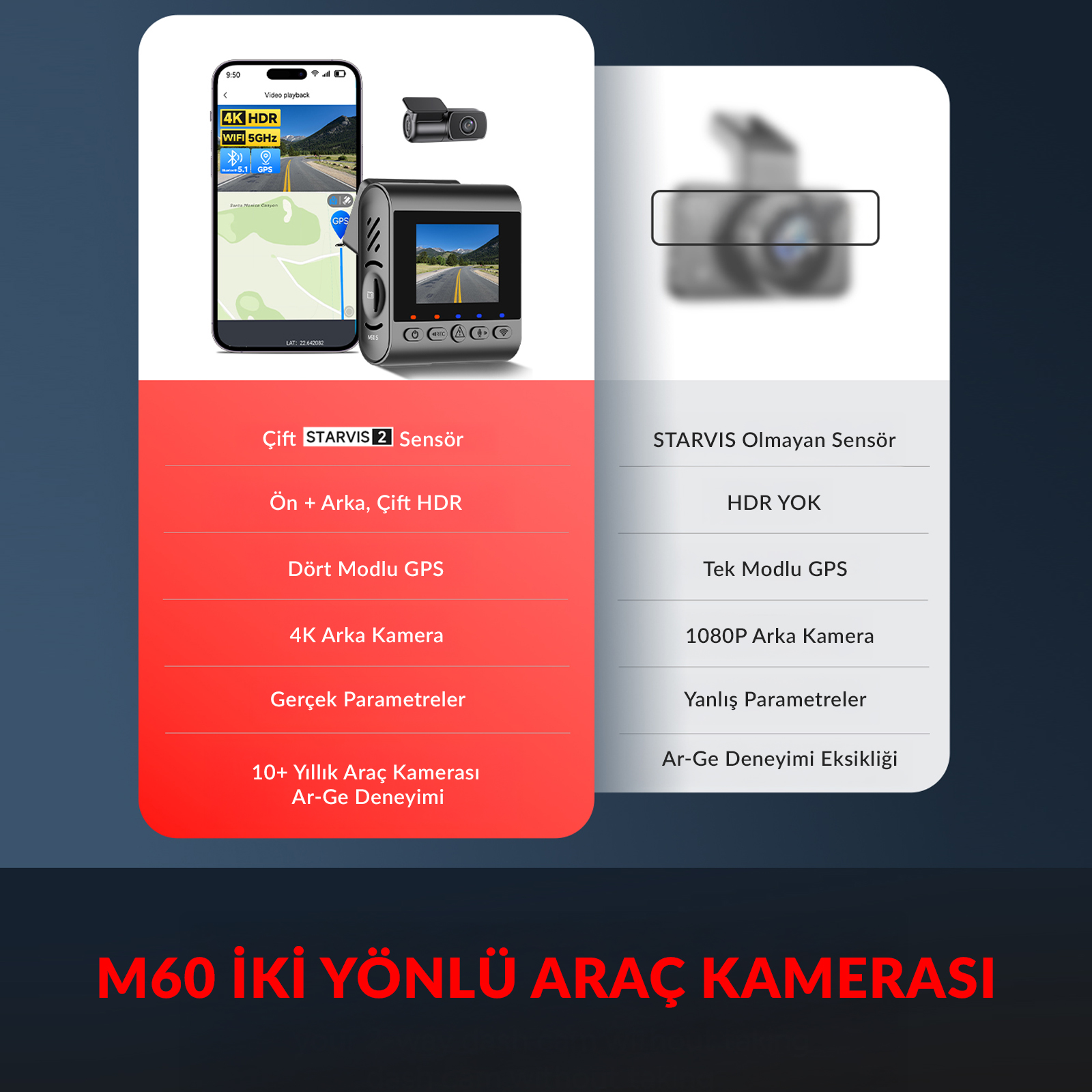 İki kameralı araç kamerası yapısındaki M60, ön kamerada 170° geniş görüş açısı ile yolun daha fazlasını yakalar. Lens 75° ye kadar ayarlanabilir özelliğe sahiptir ve optimal kapsama alanı sağlar. Arka kamera ise 160° görüş açısıyla aracınızın arkasını tamamen koruma altına alır. Bu ön arka araç kamerası sistemi ile kör nokta kalmaz.