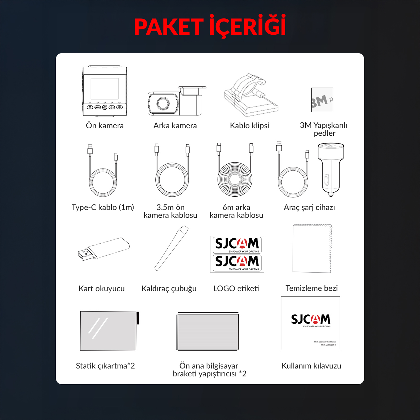 Ürün paketi içerisinde hafıza kartı bulunmamaktadır. SJCAM M60 araç kamerası 256GB kapasiteye kadar microSD kart destekler. Kesintisiz ve uzun süreli kayıt için yüksek hızlı Class 10 veya UHS-I microSD kart kullanılması önerilir. Döngüsel kayıt özelliği sayesinde kart dolduğunda eski kayıtların üzerine otomatik olarak yazar.