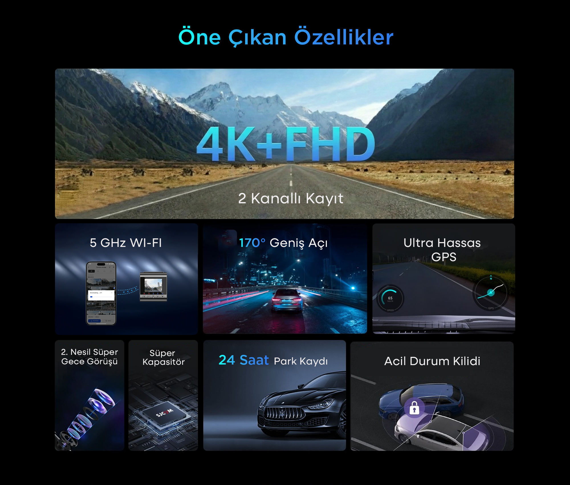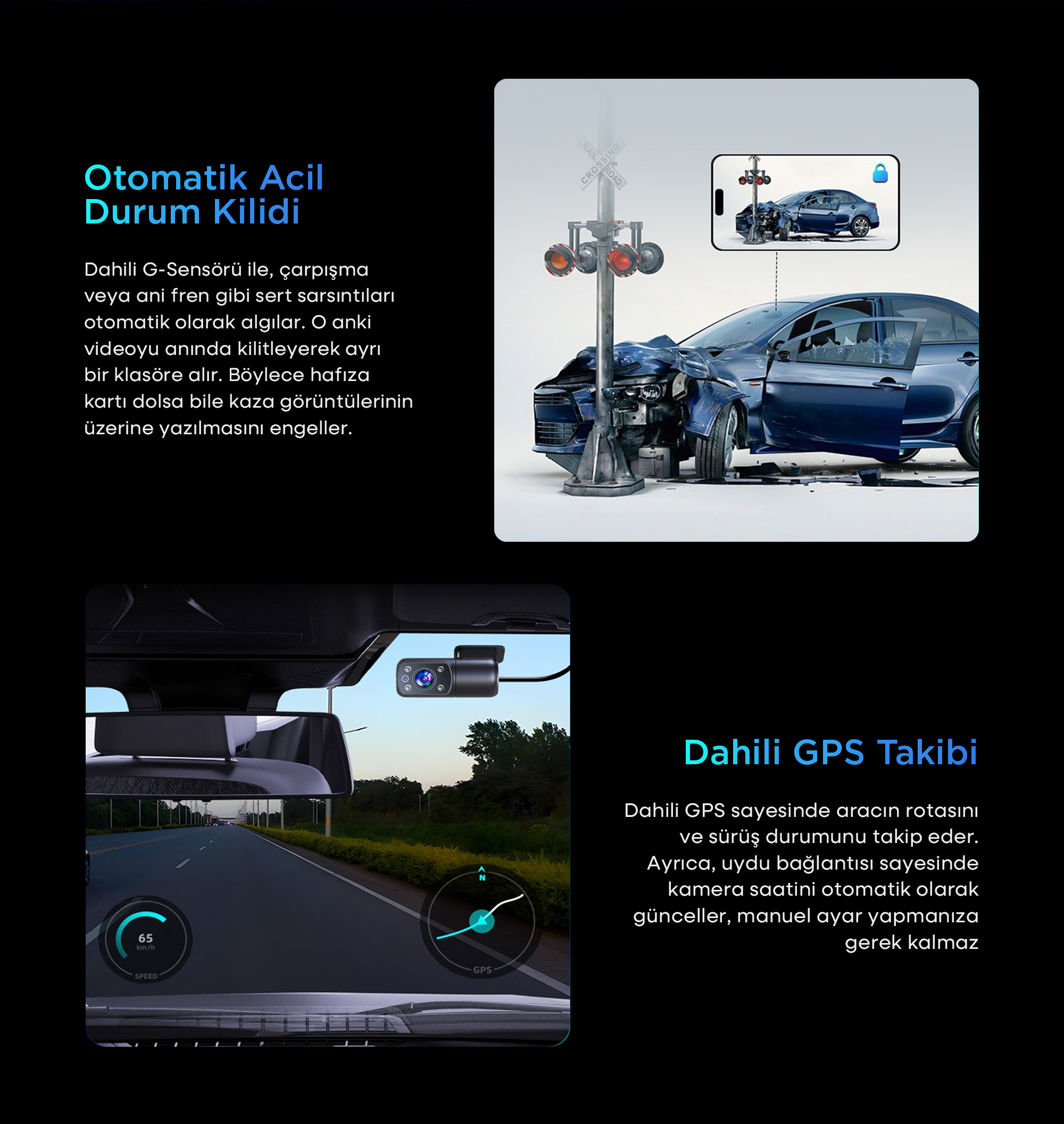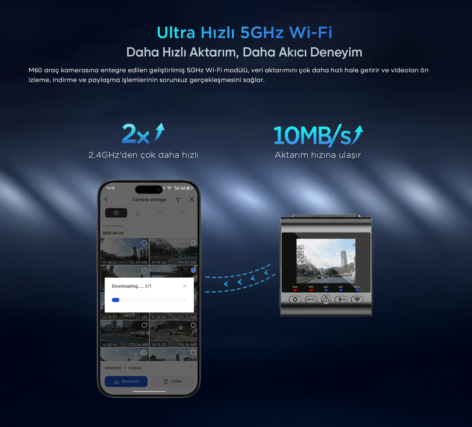 M60 araç kamerasına entegre edilen geliştirilmiş 5GHz Wi-Fi modülü, çok daha hızlı veri transferi sağlar. Video önizleme, indirme ve paylaşma işlemlerini sorunsuz gerçekleştirebilirsiniz. GPS modülü BEIDOU uydu konumlandırma sistemini kullanarak konumlandırma doğruluğunu ve kararlılığını artırır.