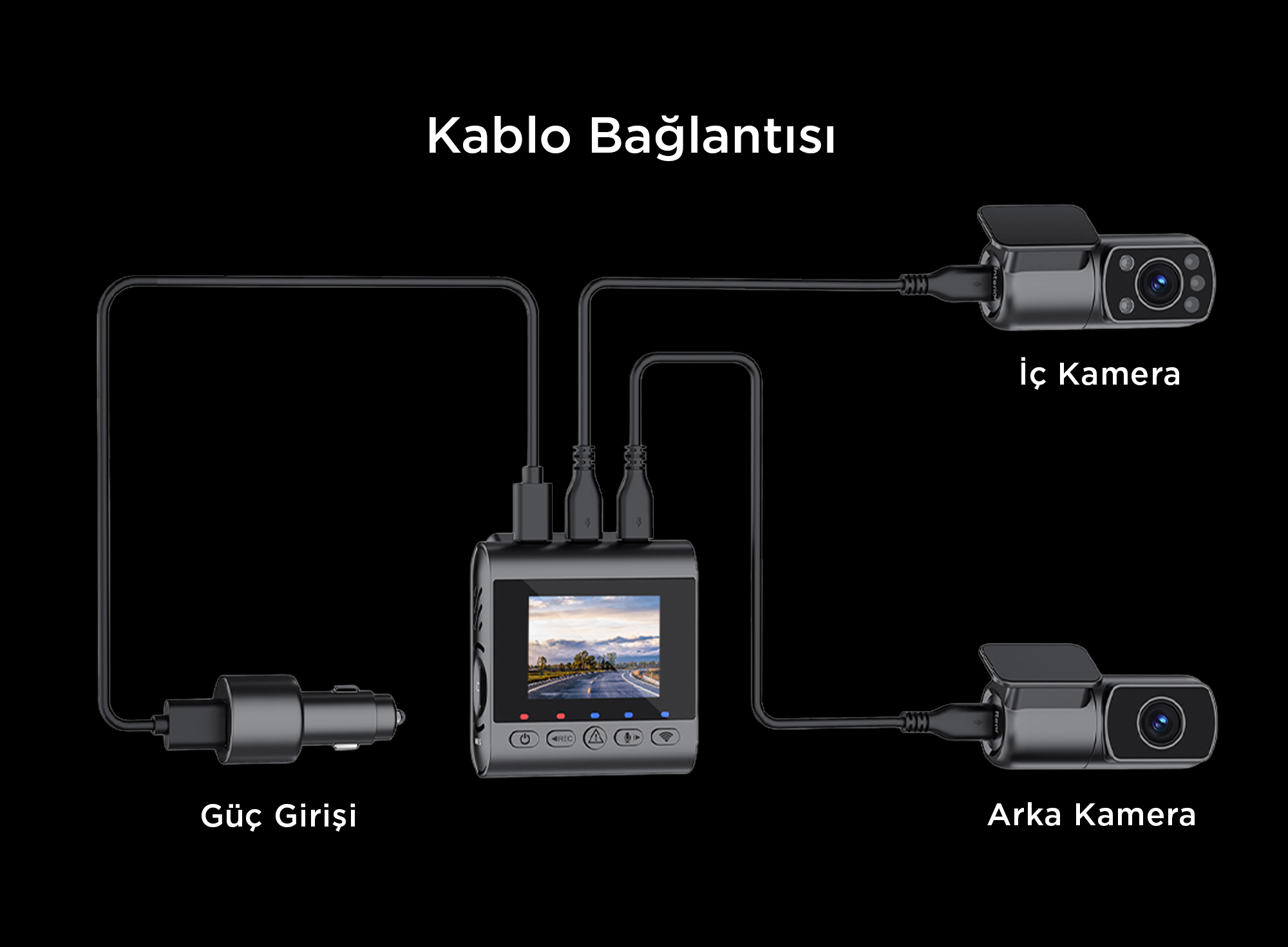 Cihazın kendi bataryası kısa süreli kayıtlar için uygundur. Ancak aracınız park halindeyken (kontak kapalıyken) uzun süreli güvenlik kaydı (Time-Lapse veya Darbe Algılama) yapmak isterseniz, sigorta kutusuna bağlanan Type-C Hardwire Kit (Park Modu Kablosu) kullanmanız gerekmektedir.