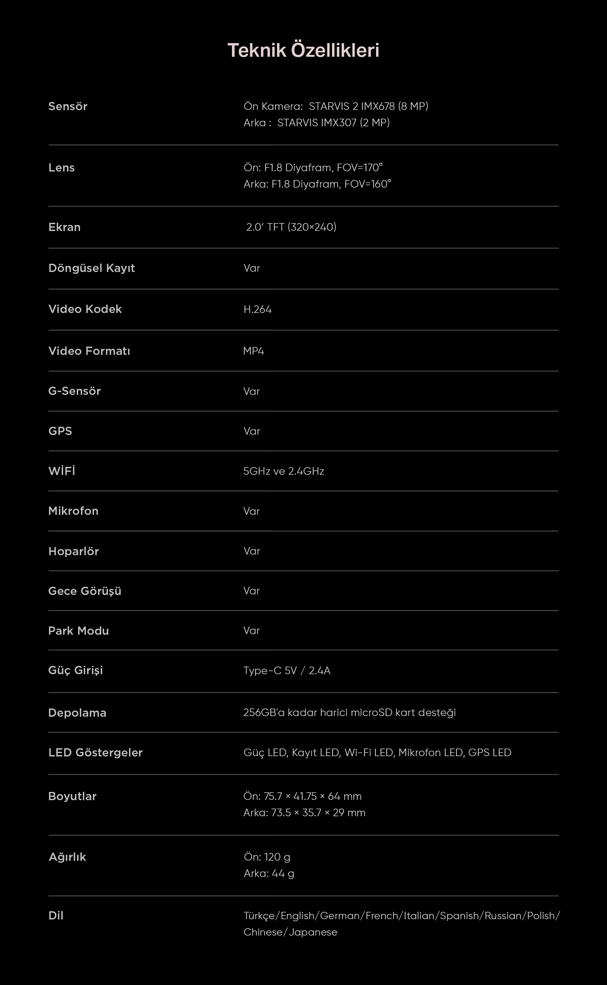 • Lens: Ön: F1.8 Diyafram, FOV=170°, Arka: F1.8 Diyafram, FOV=160°