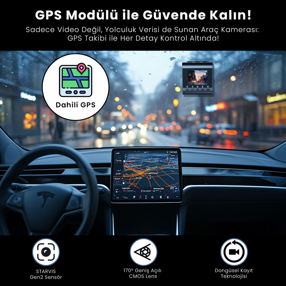 Ön kameradaki Sony Starvis 2 sensörü ve F1.8 diyafram açıklığı sayesinde gece sürüşlerinde plaka okuma performansı çok yüksektir. İç kamerada ise kabin içi karanlık olsa dahi net görüntü almanızı sağlayan özel gece görüş desteği bulunur.