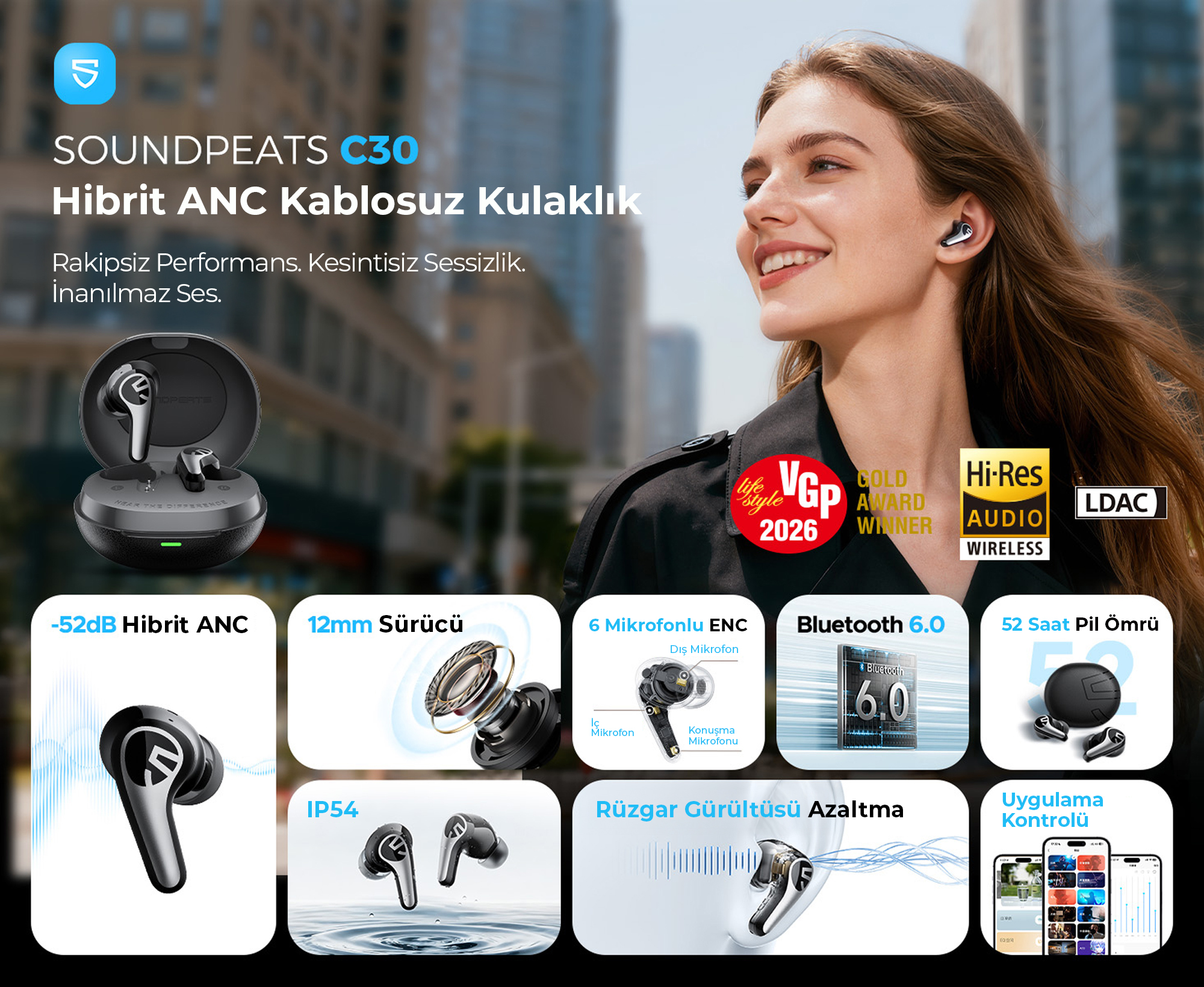 • Gürültü Engelleme: 52dB Hibrit ANC