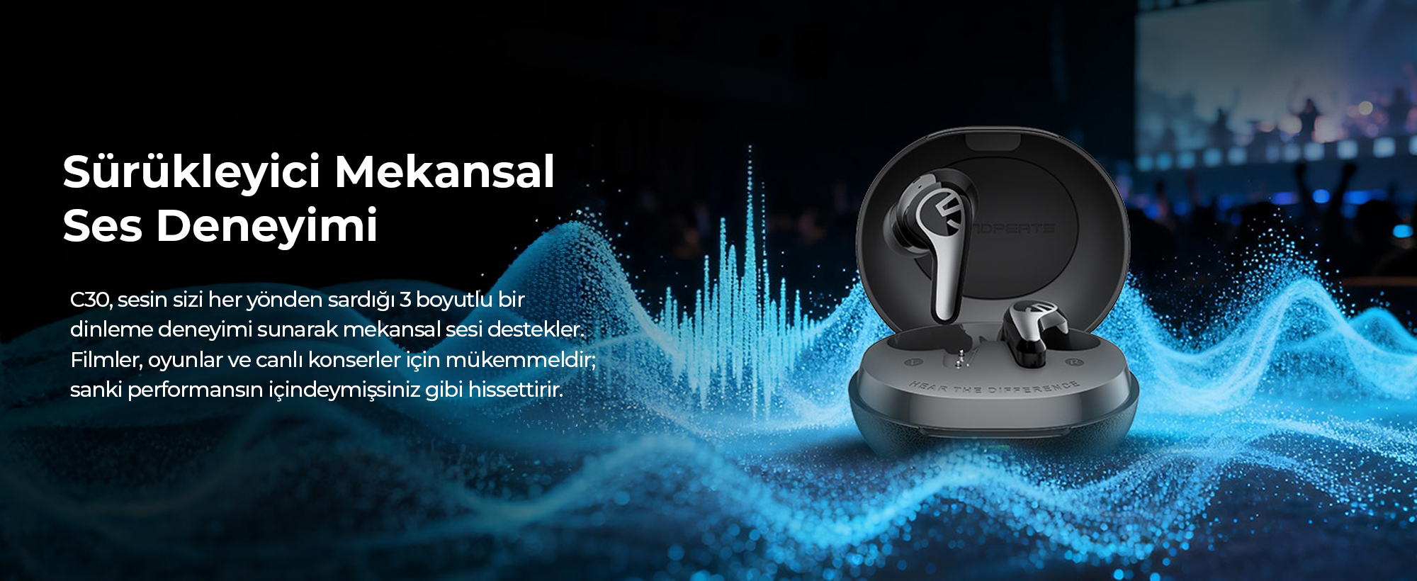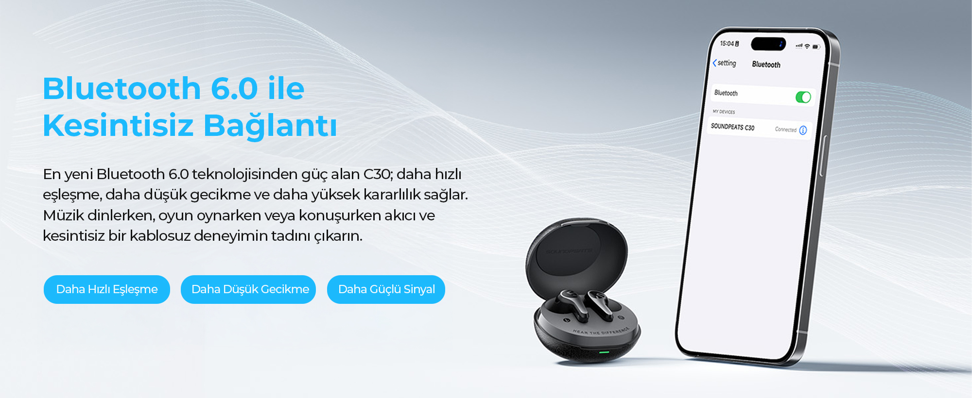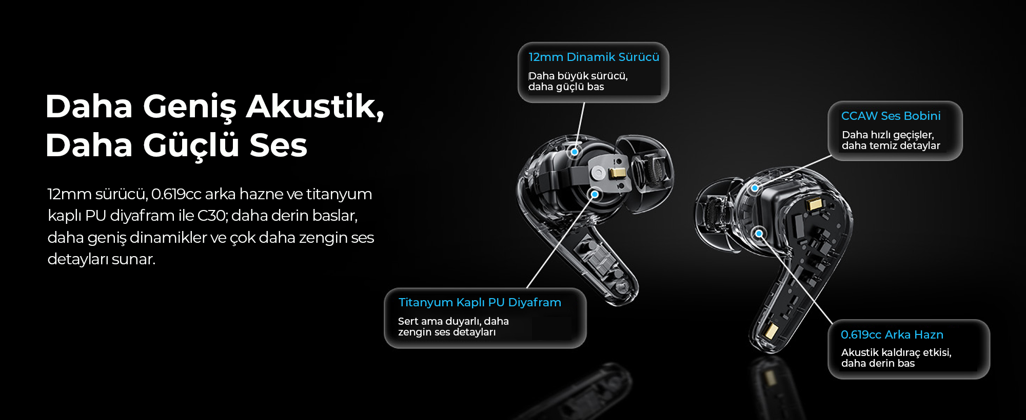En yeni Bluetrum BT8972H işlemci ile donatılan C30, veri aktarım hızını ve kapsama alanını maksimize ederek kablosuz bağlantı standartlarını yeniden belirliyor. Sinyal yoğunluğunun yüksek olduğu alışveris merkezi veya metro gibi alanlarda bile kopma yaşatmayan bu teknoloji, ultra düşük güç tüketimiyle pil verimliliğini zirveye taşır.