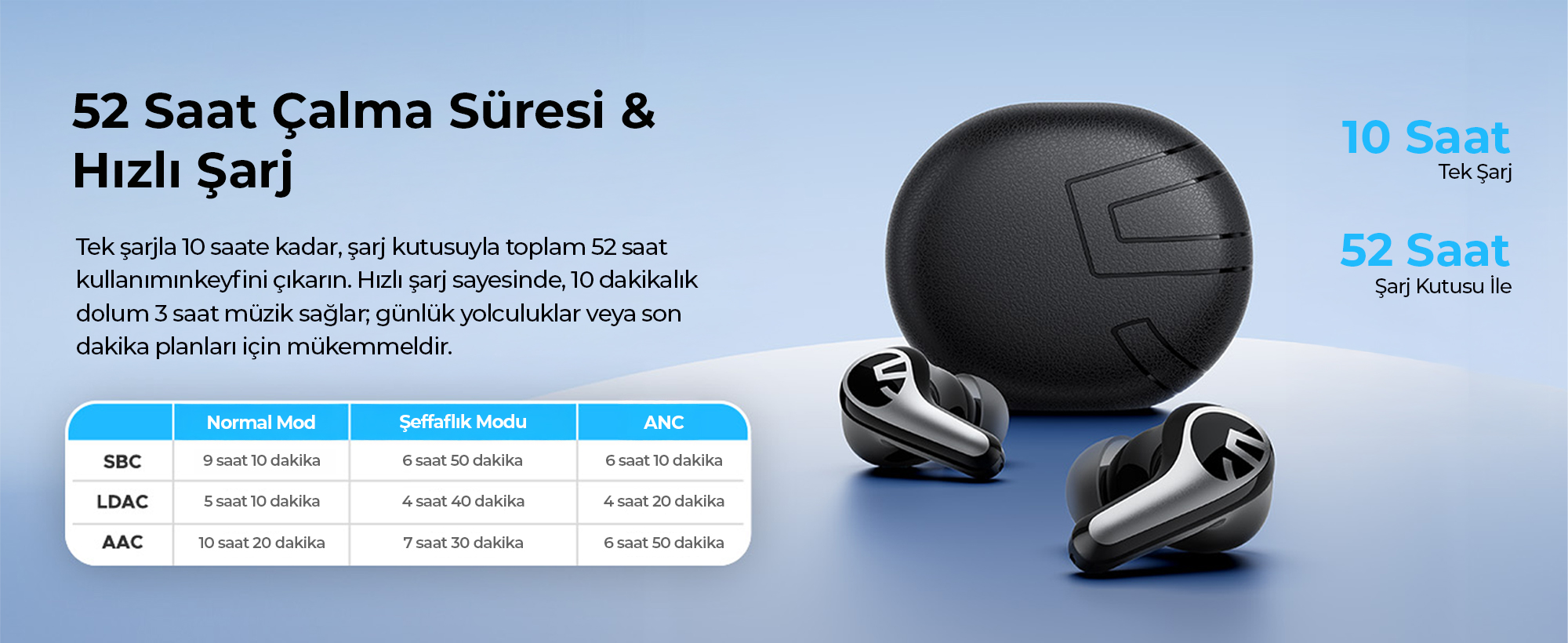 Kulaklıklarda tek şarjla 10 saat, şarj kutusuyla birlikte toplam 52 saatlik devasa kullanım süresi sayesinde, uzun yolculuklarda veya yoğun iş haftalarında şarj aletine gerek kalmaz. Aceleniz olduğu anlarda, sadece 10 dakikalık hızlı şarj ile 3 saat boyunca kesintisiz müzik keyfi yaşayın.