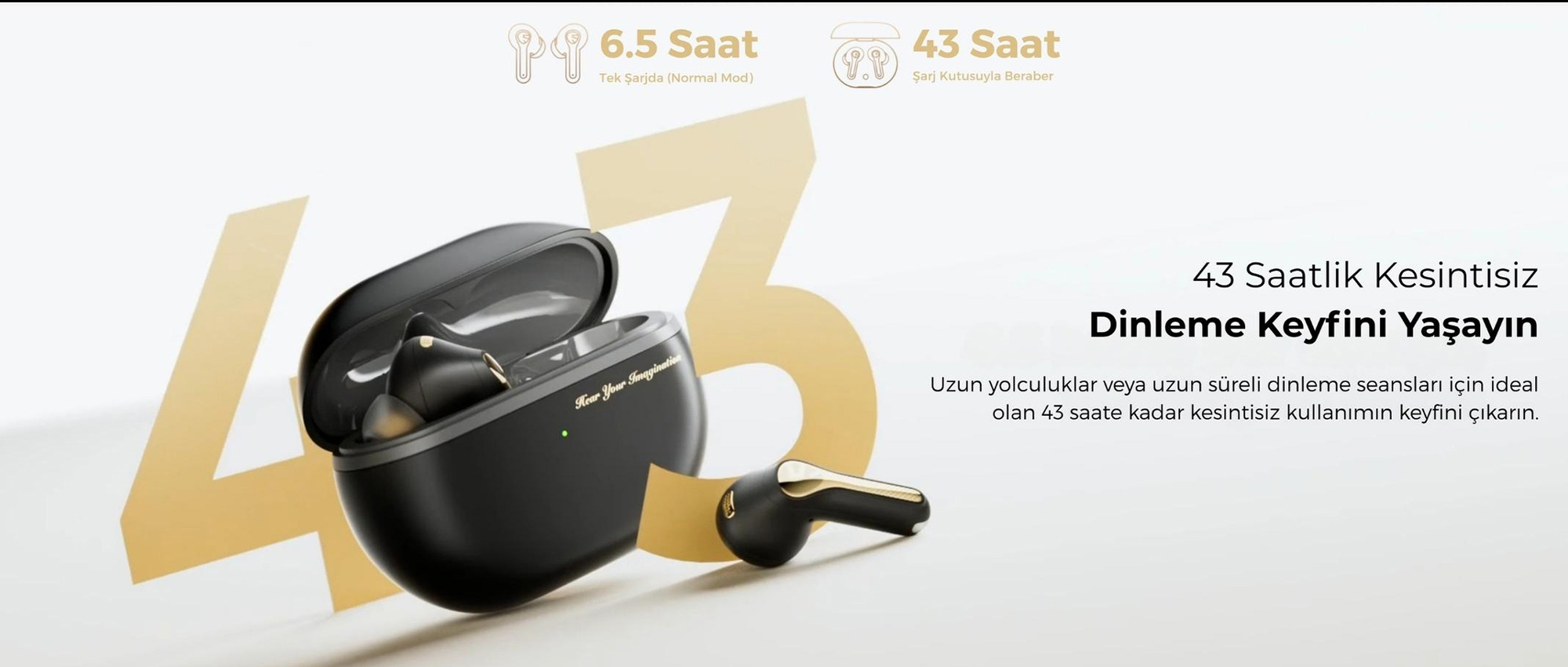 Kulaklıklar ve şarj kutusuyla birlikte toplamda 43 saate kadar kesintisiz müzik dinleme süresi sunar.