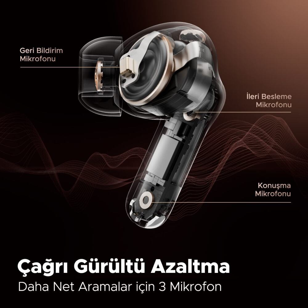 İki kulaklıkta da 3 yerleşik mikrofon (Geri bildirim/İleri Besleme/Konuşma), arka plan gürültüsünü filtrelemek ve sorunsuz ve etkili iletişim için rüzgar sesini iptal etmek için toplamda 6 mikrofon bulunur. Böylelikle arama sırasında sesinizi çok net duyurabilirsiniz. İş görüşmeleri ve toplantılar için mükem-meldir. Hibrit ANC ve Premium CVC 8.0 gürültü önleme teknolojisi ile aramaların konuşma netliğini iyileştirebilir, aramalar sırasında çevrenizdeki ortam gürültüsünü azaltabilir, aramalar, çevrimiçi kurslar ve görüntülü/sesli sohbetlerde rahatlıkla kullanabilirsiniz.