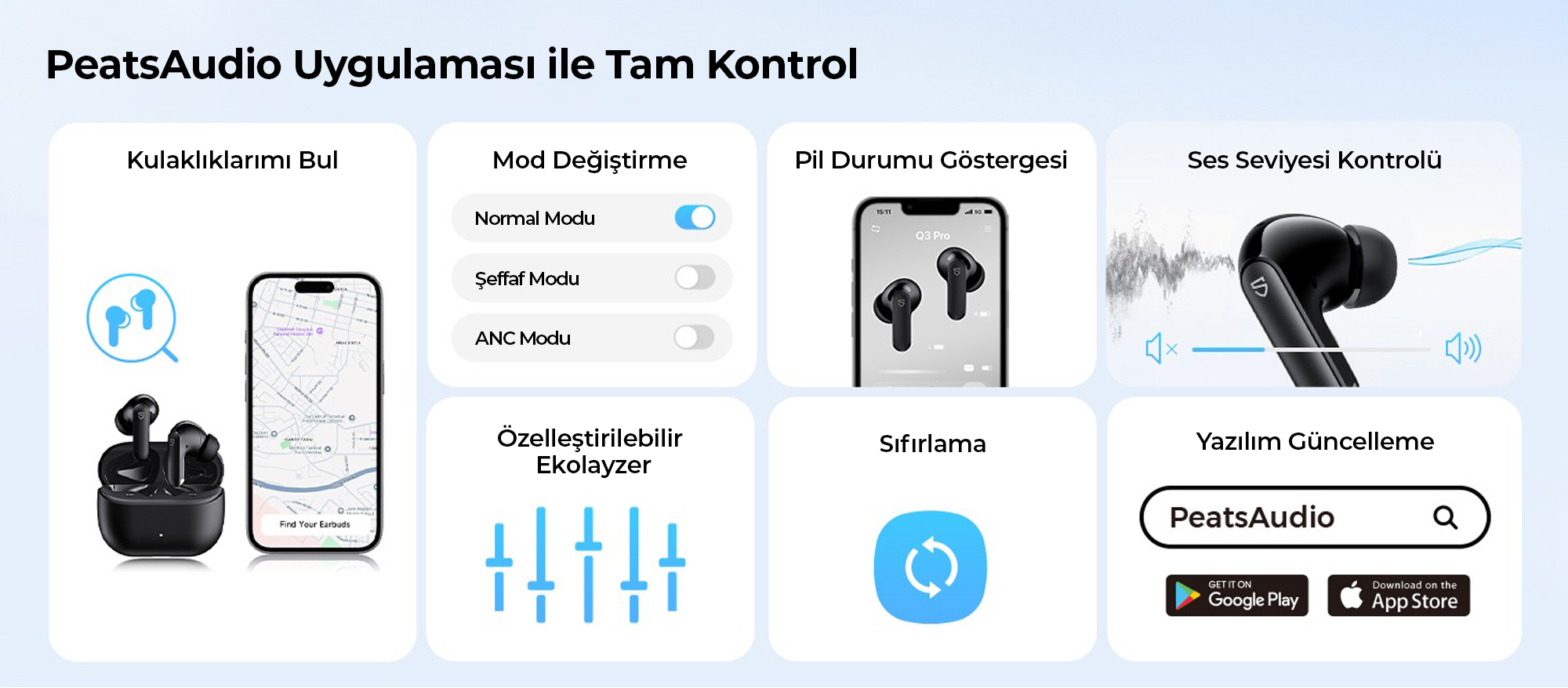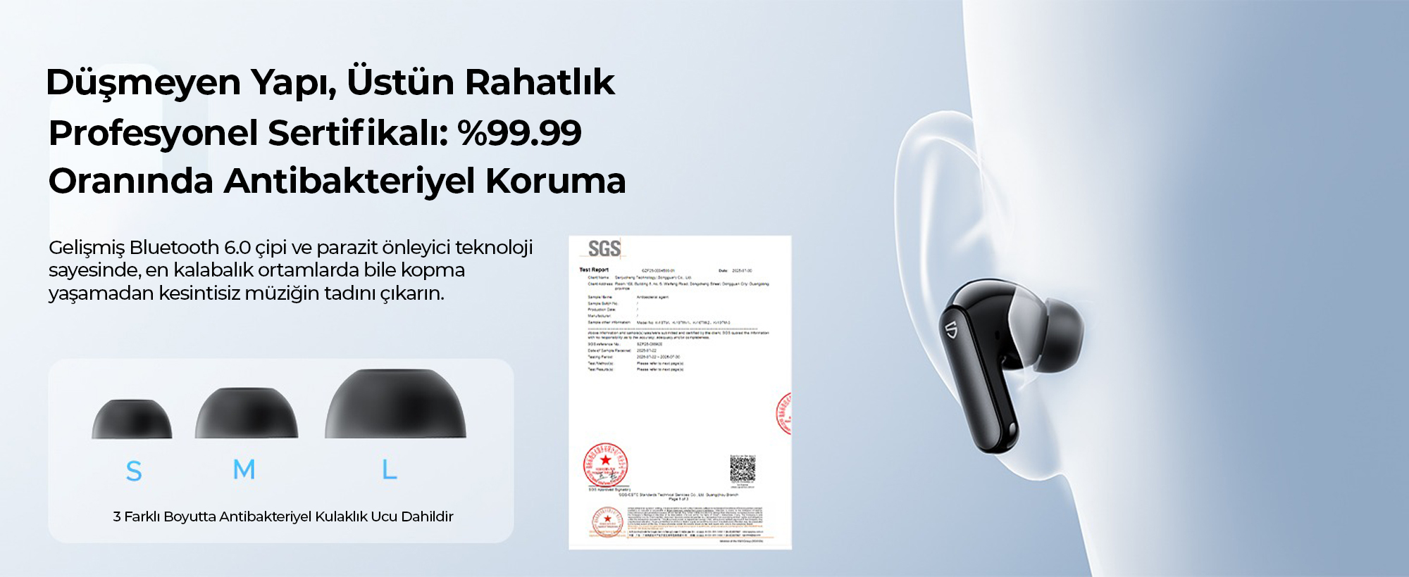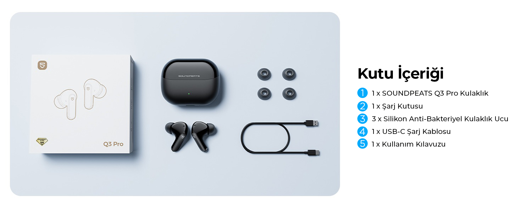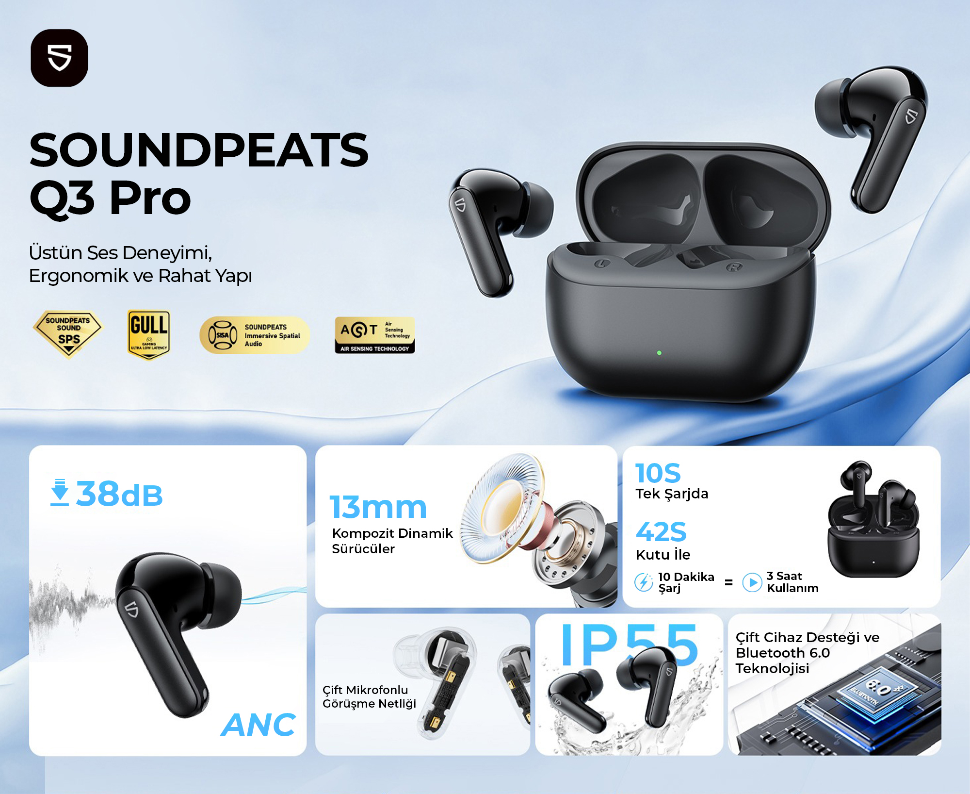 SoundPEATS Q3 Pro, Bluetooth 6.0 teknolojisi ve Bluetrum BT8912F işlemcisiyle kalabalık alanlarda bile kopmayan bir bağlantı sunar. 13mm devasa sürücüleri ve -38dB Hibrit ANC gücüyle stüdyo kalitesinde ses ve derin sessizlik sunarken; %99.9 anti-bakteriyel uçlara sahip kilitli tasarımıyla sağlığınızı ve konforunuzu garanti altına alan, teknoloji ve hijyenin mükemmel birleşimidir.