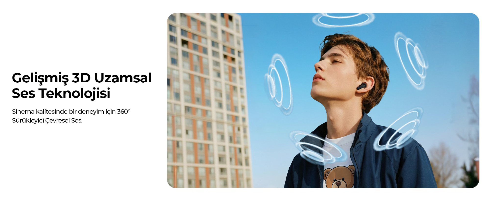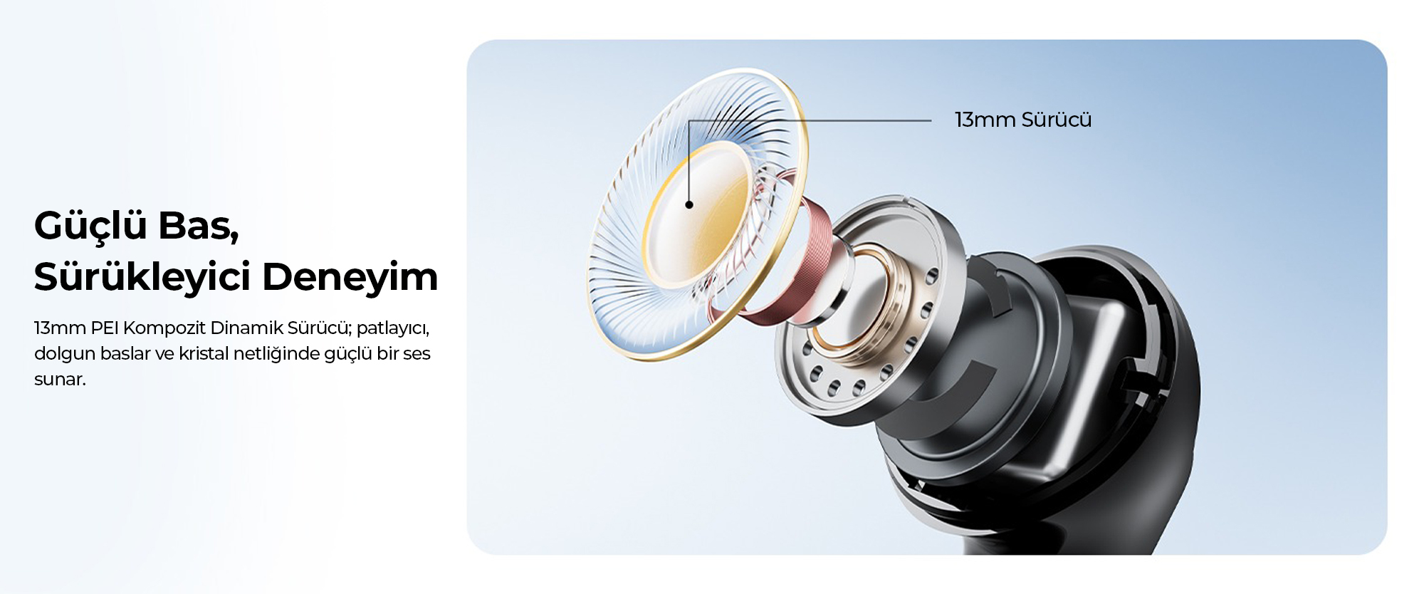 Standartların çok ötesindeki 13mm çaplı kompozit diyafram sürücüler, daha geniş bir yüzey alanıyla hava akışını yöneterek derin, sarsıcı baslar ve kristal netliğinde tizler üretir. SPS Laboratuvarı'nın "Altın Etiket" sertifikasıyla tescillenen bu akustik yapı, Uzamsal Ses (Spatial Audio) moduyla birleşerek sinematik bir deneyim yaratır.