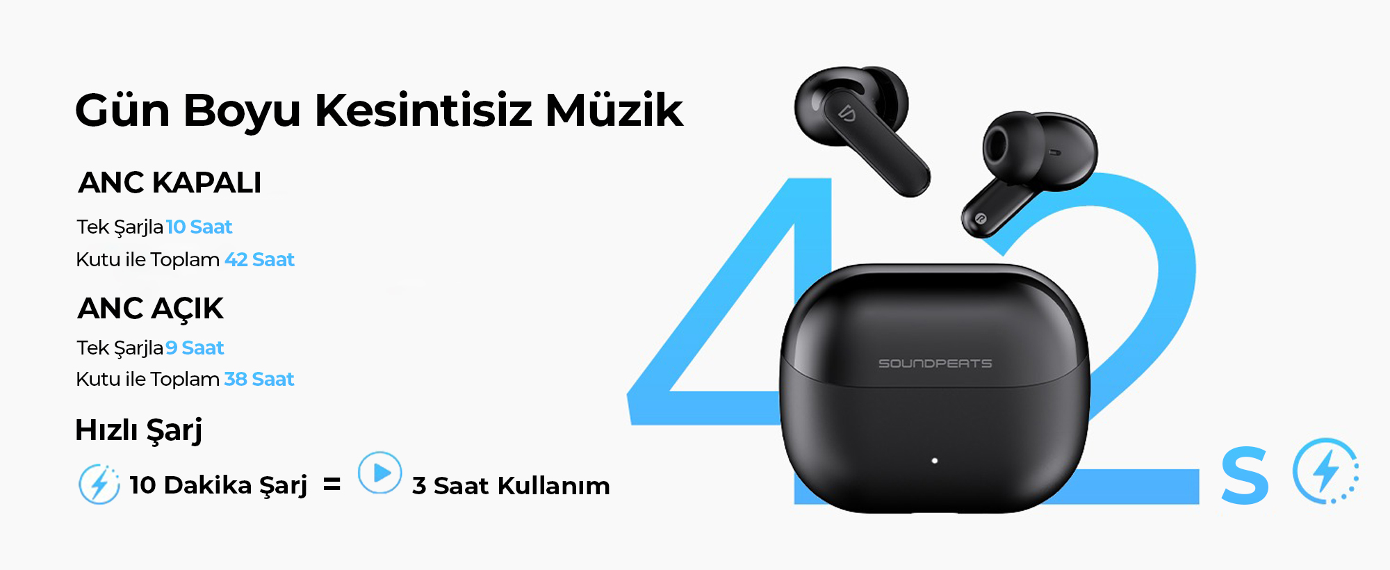 Kulaklıklarda tek şarjla 10 saat, şarj kutusuyla birlikte toplam 42 saate varan devasa kullanım süresi sunar. Flash Charge teknolojisi sayesinde sadece 10 dakikalık şarj ile 3 saatlik kesintisiz müzik keyfi elde edin.