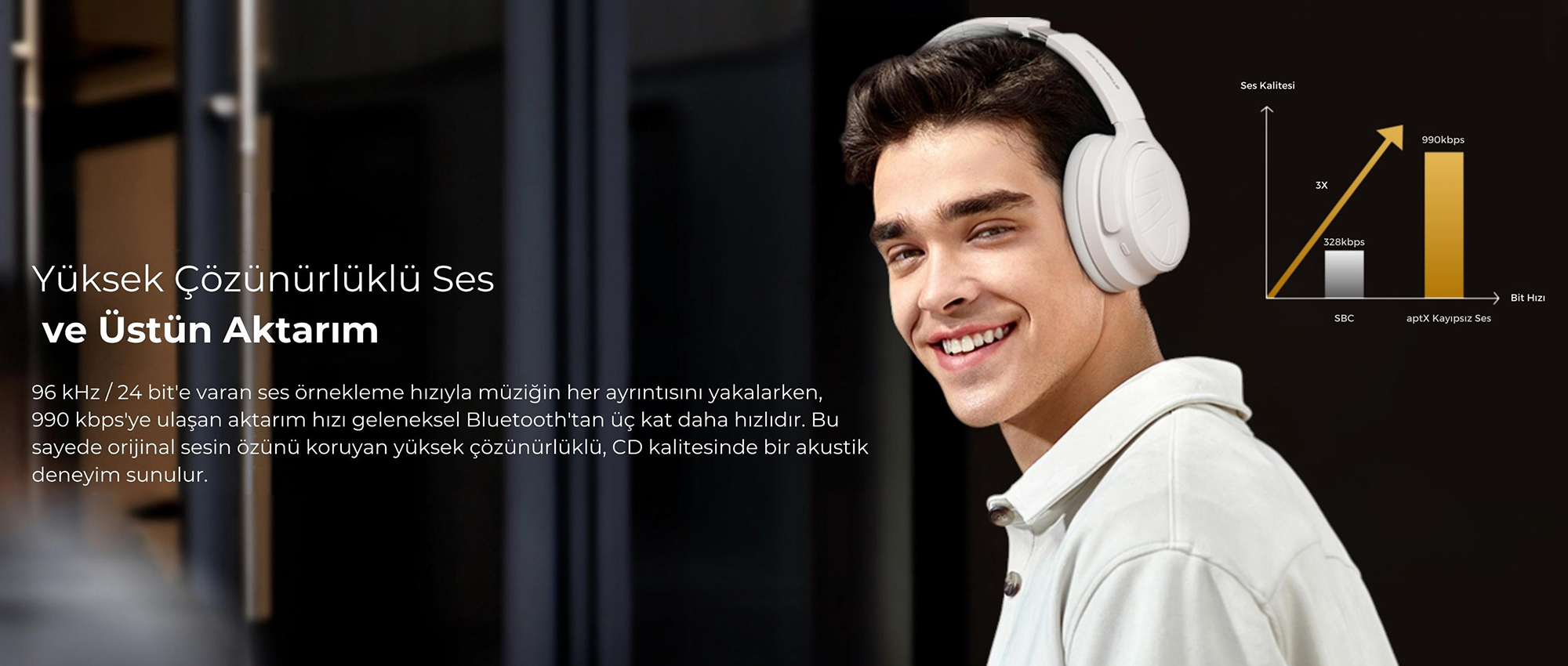 LDAC, yüksek çözünürlüklü ses aktarımı sağlar; böylece daha zengin, detaylı ve net ses deneyimi sunar.
