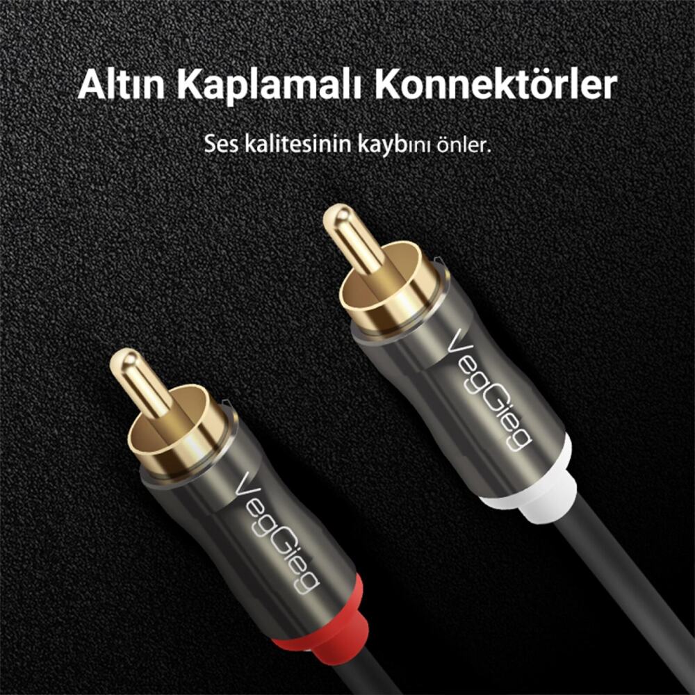 VegGieg 2RCA to 2RCA Ses Kablosu 1.5 Metre, 2RCA kablosu, yüksek kaliteli ses sinyalleri taşır. Özellikle stereo ses sistemlerinde, sağ ve sol kanalları ayrı ayrı iletmek için kullanılır. Televizyon, DVD, Blu-ray, müzik çalar, amplifikatör veya hoparlör gibi cihazlar arasında ses iletimi sağlar. Sağ ve sol kanalları ayrı ayrı ileterek stereo ses deneyimi sağlar. Altın kaplama konektörler, gelişmiş ses / video sinyal aktarımı ve daha az sinyal paraziti sağlar.