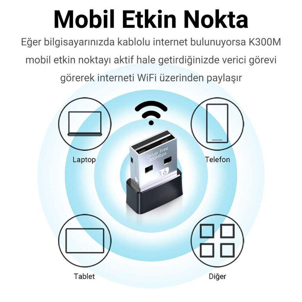 VegGieg K300M 300Mbps çift bantlı Wi-F alıcı verici USB adaptör, Wi-Fi özelliği bulunmayan masaüstü bilgisayarlarınıza veya WiFi çipi arızalanan notebook ve laptoplara kablosuz internet bağlantısı sağlamanız için tasarlanmıştır. 300Mbps aktarım hızını destekler böylece internet hızınızı kısıtlamadan tüm gücüyle kullanabilirsiniz. 2.4GHz ve 7.125GHz frekansında aynı anda çalışan K300M mesafe nedeniyle performans kaybı yaşamanıza sebep olmaz. Verici özelliği sayesinde bilgisayarınıza gelen kablolu interneti modemden uzak ortamlarda kablosuz olarak paylaşarak telefon, tablet veya Wi-Fi üzerinden internete ihtiyaç duyan diğer cihazlarınız için daha hızlı bir kablosuz internet bağlantısı sağlar. WPA3 güvenlik standardı sayesinde verici modunda paylaştığınız internet güvenli hale gelir. K300M sahip olduğu entegre nano anten sayesinde hafif ve küçük bir tasarıma sahiptir. Aynı zamanda Nikel kaplaması sayesinde K300M paslanma aşınma gibi dış koşullara yüksek dayanıklılık gösterir böylece uzun ömürlü bir yapıya sahip olur. Bilgisayarınıza ilk kez bağlantı sağladığınızda tek seferlik kısa bir sürücü kurulumunun ardından tekrar kurulum olmadan tak çalıştır olarak kullanmaya başlayabilirsiniz.