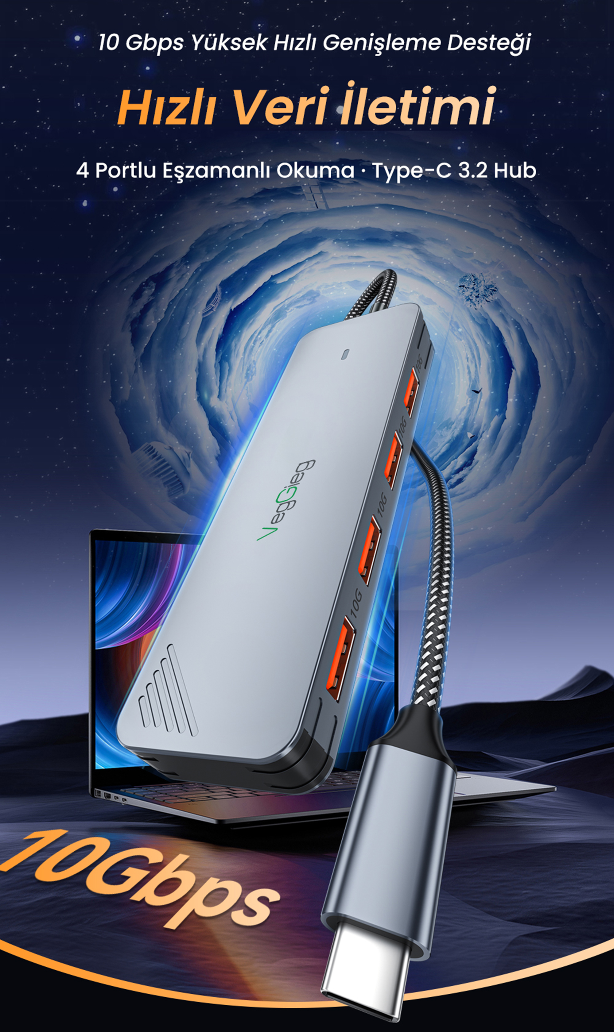 - 1 x VegGieg 4 Portlu 10Gbps Type-C to 4*USB-A 3.2 Gen2 Çoklayıcı Dönüştürücü Hub