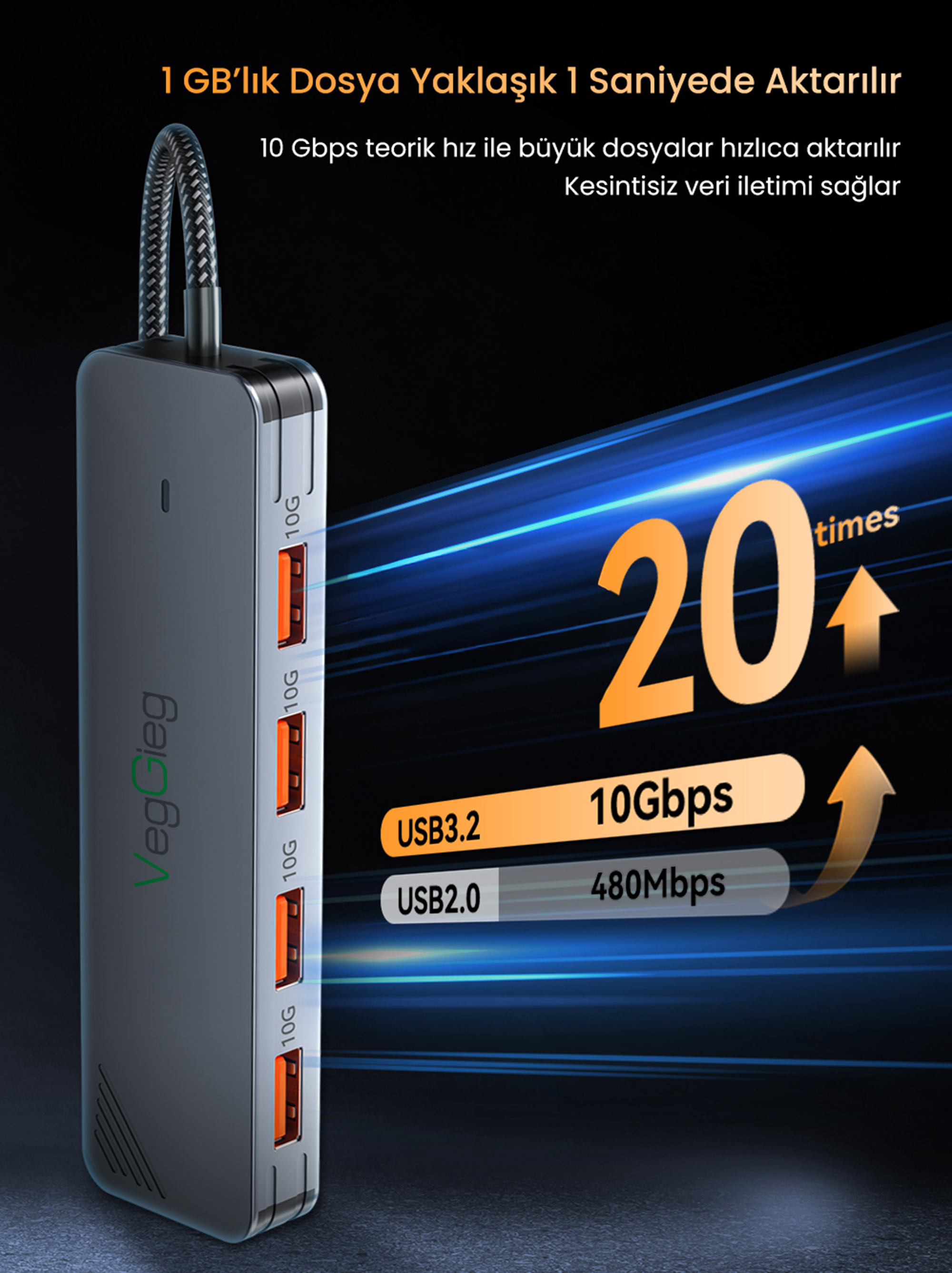 VegGieg, USB 3.2 Gen2 bağlantı standardını destekleyerek 10Gbps’ye kadar yüksek veri transfer hızı sunar. Bu sayede büyük boyutlu dosyaların aktarımı, harici disk kullanımı ve USB bellek işlemleri daha kısa sürede tamamlanır. Günlük ofis kullanımının yanı sıra yoğun veri transferi gerektiren senaryolarda da stabil ve akıcı bir performans hedefler.