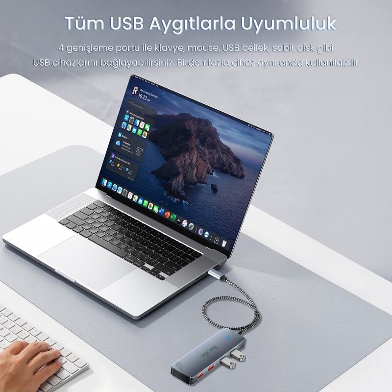 Üzerinde yer alan 4 adet USB-A çıkış portu, birden fazla çevre biriminin eş zamanlı olarak bağlanmasına olanak tanır. Klavye, mouse, USB bellek, harici disk, yazıcı gibi cihazlar tek bir hub üzerinden pratik şekilde kullanılabilir. USB-C girişli cihazlarda port yetersizliği sorununu ortadan kaldırarak daha düzenli bir çalışma alanı oluşturur.