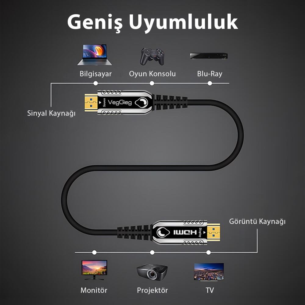 Veggieg H721 4K 60H 18bps Fiber Optik HDMI 2.0 Görüntü ve Ses Aktarım Kablosu 15 Metre, fiber optik yapısı sayesinde bakır tel ile aktarıma oranla uzak mesafelere daha sorunsuz aktarım sağlar. 4K çözünürlükte 60Hz tazeleme hızıyla birlikte size uzak mesafelerde dahi en iyi görüntü kalitesini sağlar. HDMI 2.0, 18 Gbps bant genişliği sunar bu daha yüksek çözünürlüklerde, daha fazla renk derinliğine olanak tanır Işık sinyalleri ile aktarım sağlaması sayesinde elektromanyetik parazitlere (EMI) ve radyo frekansı parazitlerine (RFI) karşı dayanıklıdır. Bu, özellikle endüstriyel ortamlarda veya yüksek parazitli alanlarda önemli bir avantajdır. Bakır kablolara göre daha hafif ve incedir bu kablonun kurulumunu ve taşınmasını kolaylaştırır. HDR ve 3D desteği sayesinde görüntülerin daha geniş bir renk gamı ve kontrast ile gösterilmesini sağlar, böylece daha gerçekçi bir görsel deneyim sunar ve 3D görüntü aktarımı yapılabilir. ARC teknolojisi sayesinde stereo sesin yanı sıra Dolby Digital ve DTS gibi sıkıştırılmış çoklu kanal ses formatlarını da destekler. PVC malzemeden üretilen dış kaplama ve altın kaplama konektörler dış koşullara karşı dayanıklıdır.