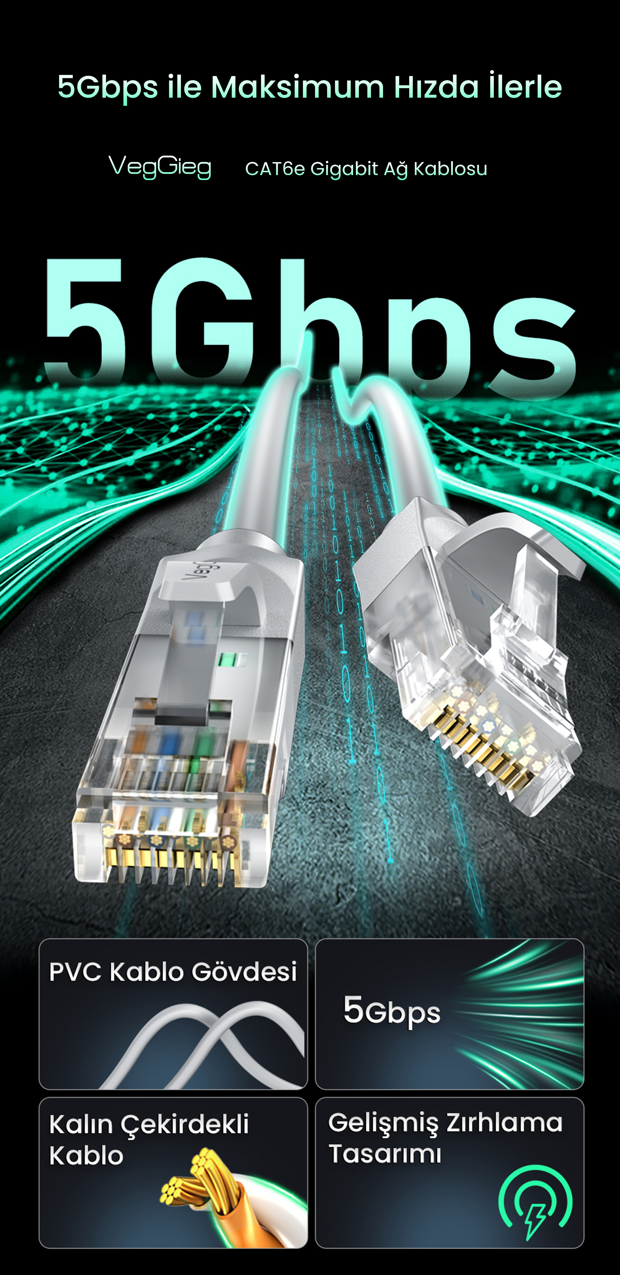 - 1 x VegGieg CAT6e UTP RJ45 Ethernet Kablosu