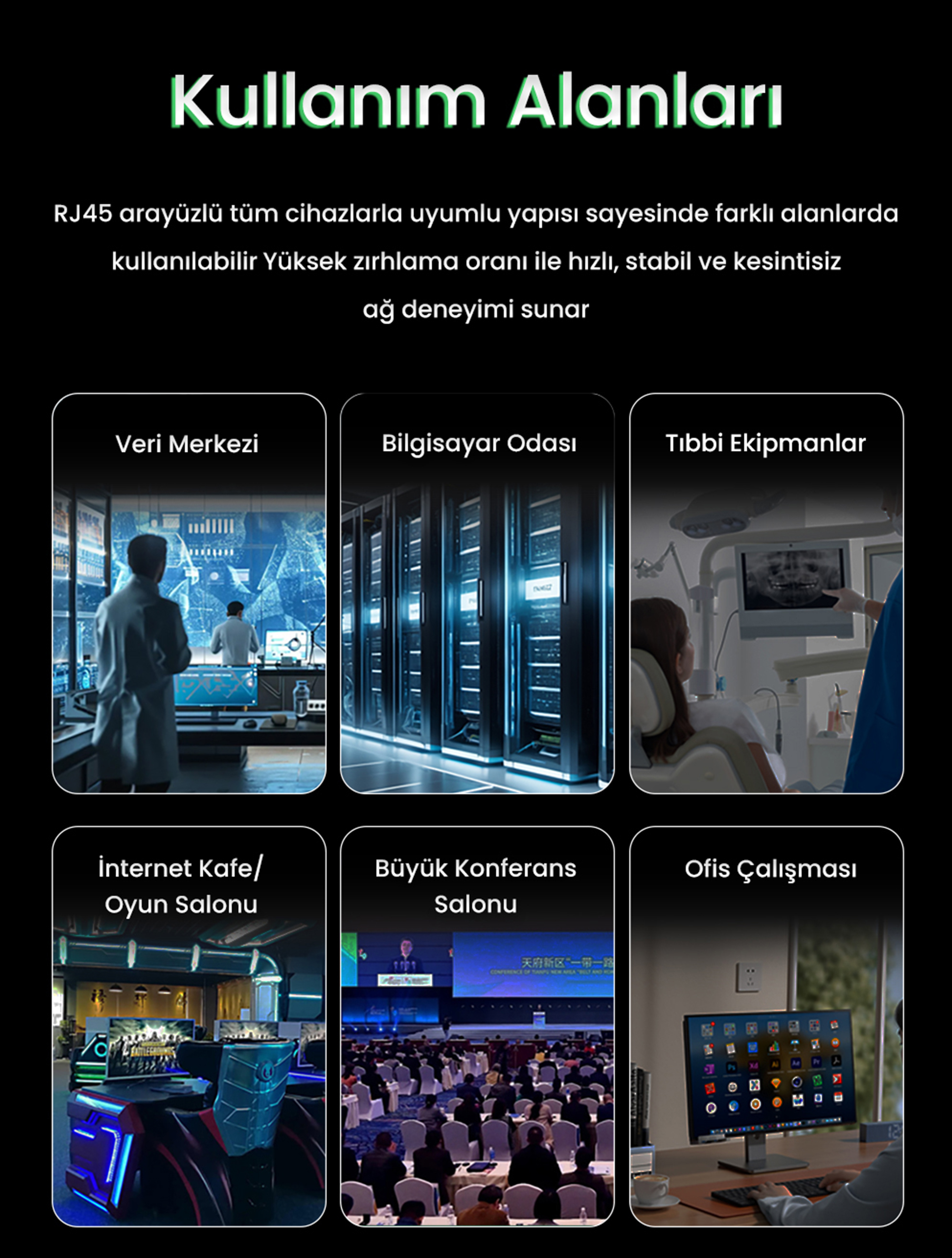 Standart RJ45 konnektör yapısı sayesinde modem, router, switch, bilgisayar ve diğer Ethernet destekli cihazlarla uyumlu olarak çalışır. Tak-çalıştır yapısı ile ek ayar gerektirmeden hızlıca kullanıma hazır hale gelir.