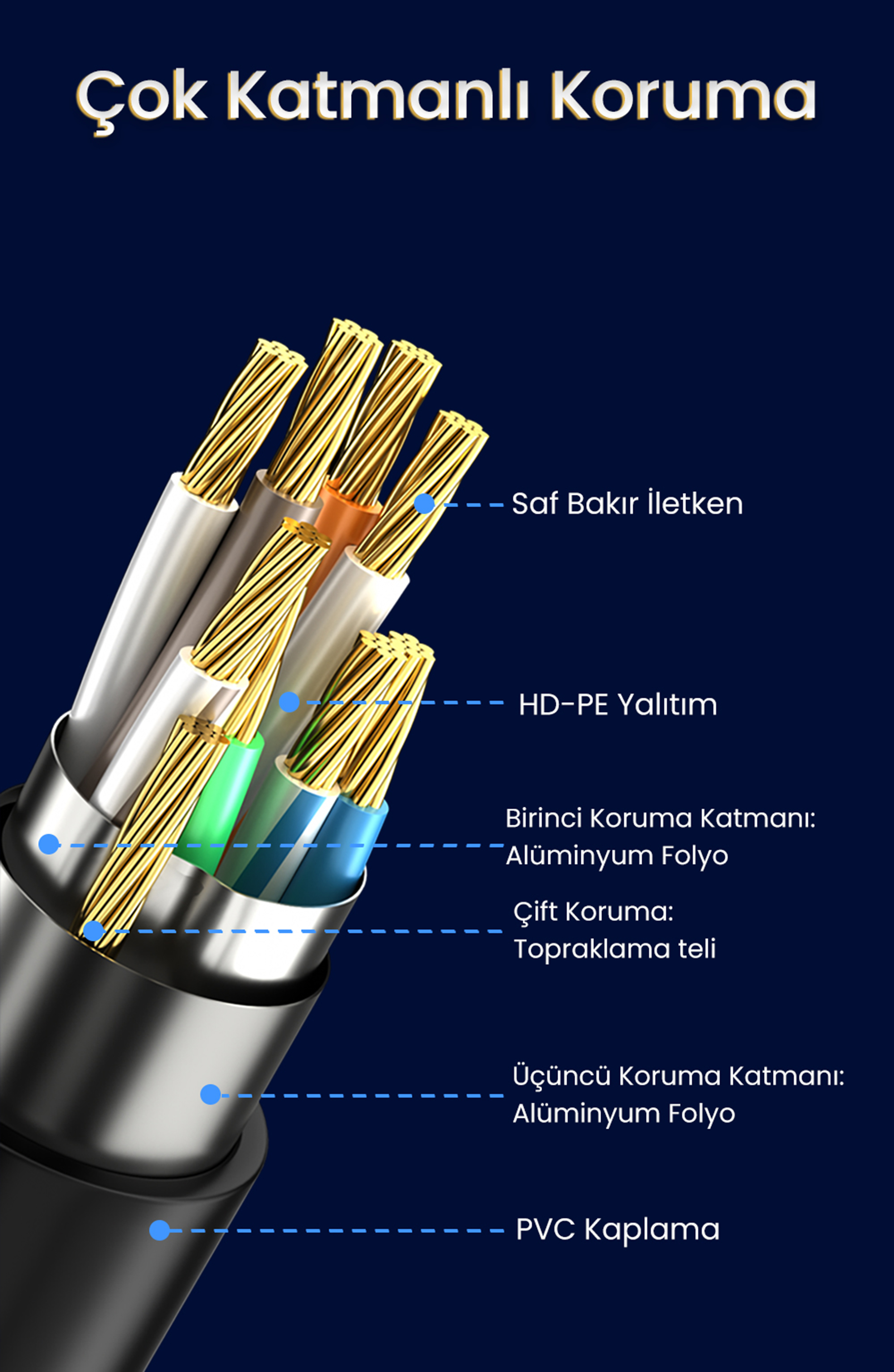 PVC dış yüzey, kablonun dış etkenlere karşı dayanıklılığını artırırken esnekliğini korur. Günlük kullanım, ofis ortamları ve profesyonel ağ sistemlerinde uzun ömürlü ve güvenli bir yapı sunarak kullanım süresini destekler.