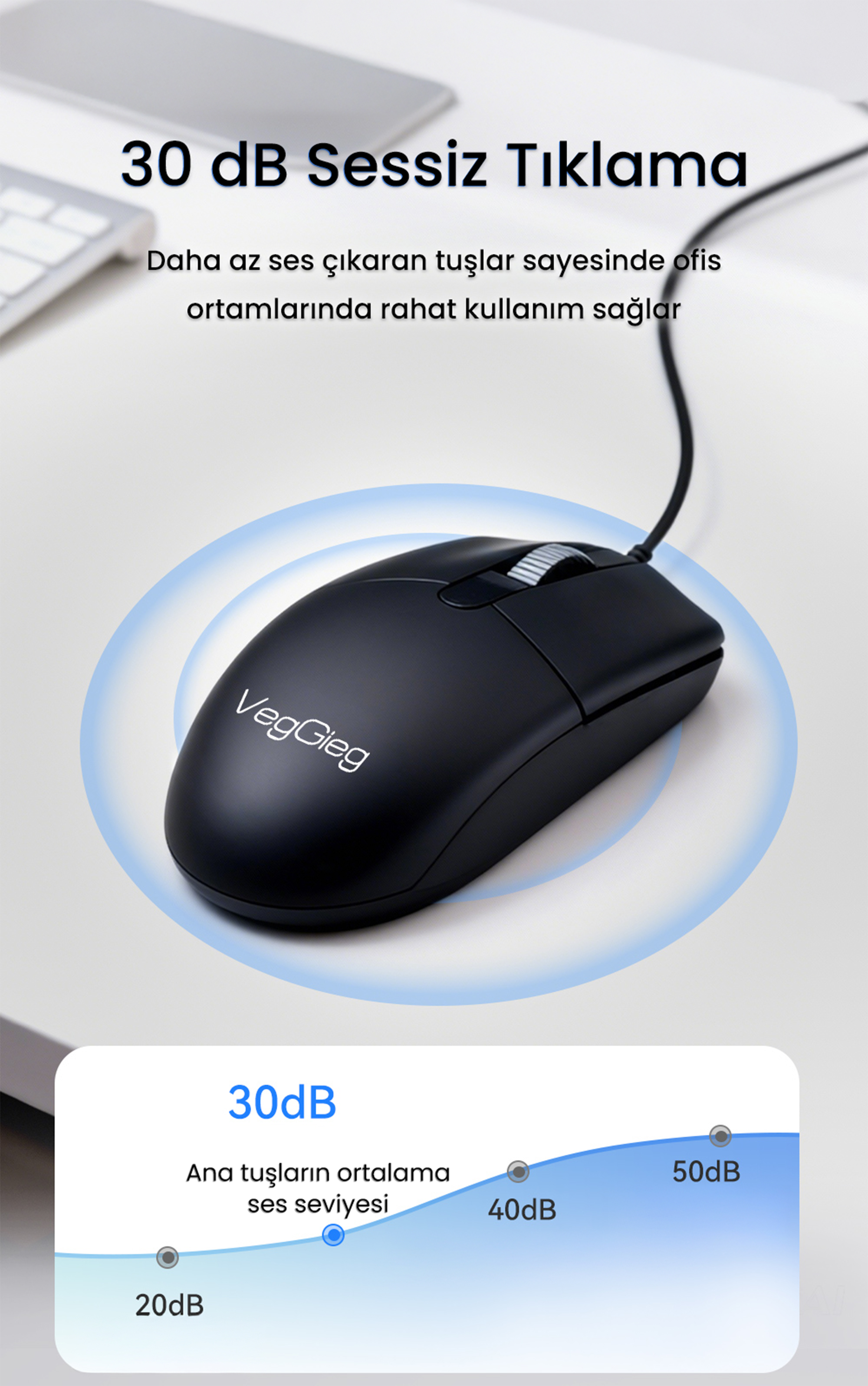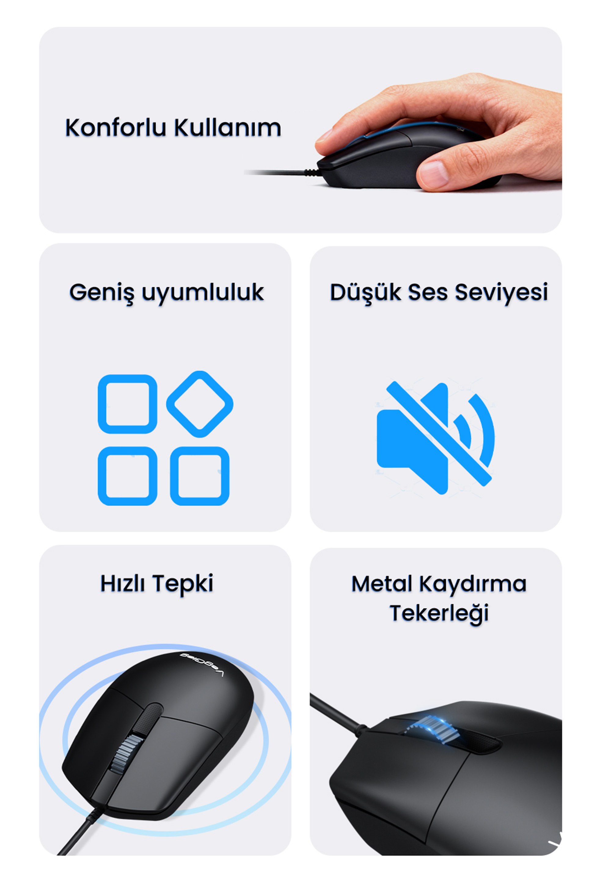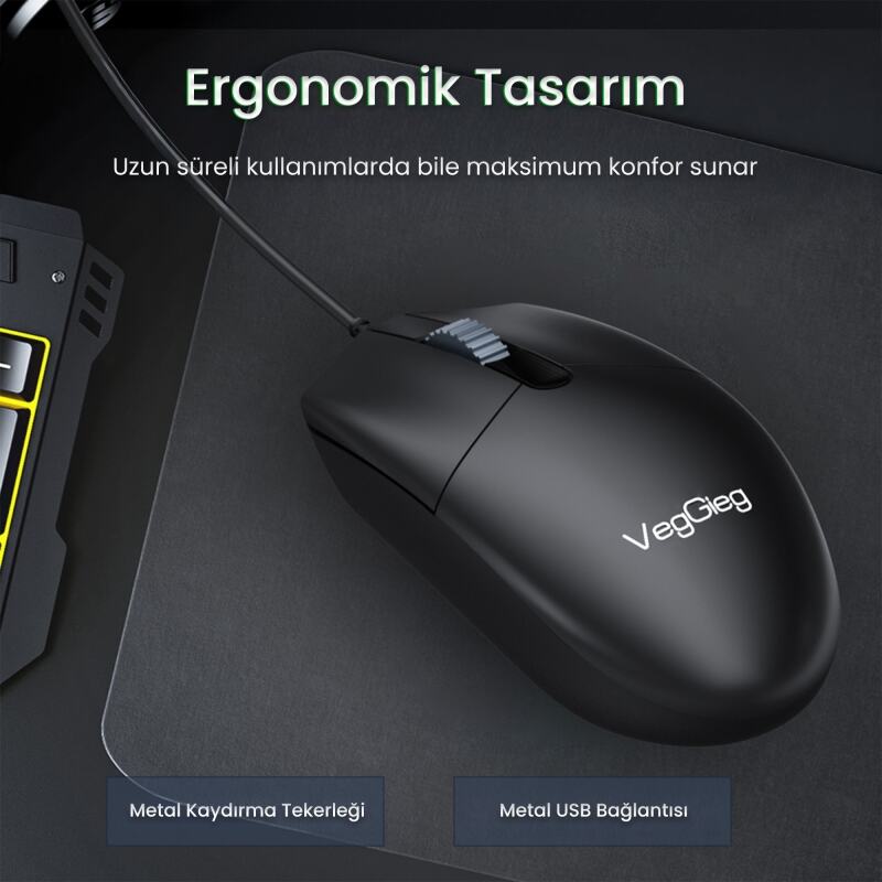 VegGieg G005 Kablolu Ofis Mouse, günlük ofis kullanımı ve uzun süreli çalışma senaryoları için tasarlanmıştır. Yüksek hassasiyetli optik algılama teknolojisi (high precision optics) sayesinde imleç hareketlerinde stabil ve kontrollü bir kullanım sunar. Üründe yer alan yüksek hassasiyetli optik motor, masaüstü uygulamaları, ofis yazılımları ve genel bilgisayar kullanımında akıcı bir deneyim sağlar. Metal korumalı yapı (metal shielded USB), bağlantı noktasında dayanıklılığı artırmayı hedefler. Metal scroll tekerleği (metal roller / metal scroll wheel), daha sağlam bir his sunarken uzun süreli kullanımda aşınmaya karşı direnç sağlar. Bu yapı, özellikle yoğun kaydırma gerektiren çalışma ortamlarında avantaj oluşturur.