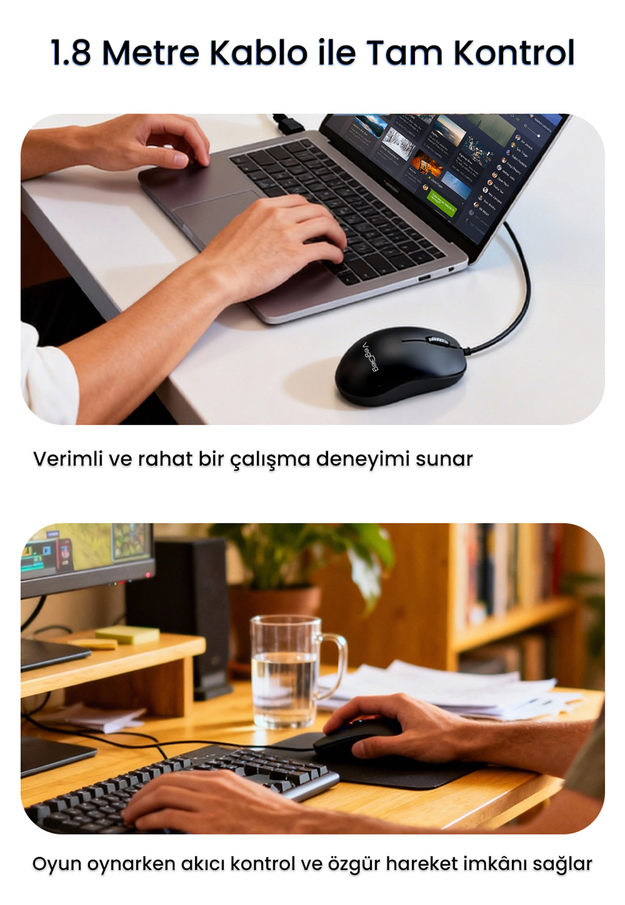 1.8 metre uzunluğundaki kablo, masaüstü bilgisayarlar ve ofis kurulumlarında geniş bir hareket alanı sunar. Bilgisayar kasasının masanın altında veya farklı bir konumda bulunduğu durumlarda rahat kullanım sağlar. Kablolu yapısı sayesinde bağlantı kesintisi riski olmadan sürekli ve stabil bir performans elde edilir. Günlük kullanımda güvenilirliği ön planda tutan kullanıcılar için ideal bir çözümdür.