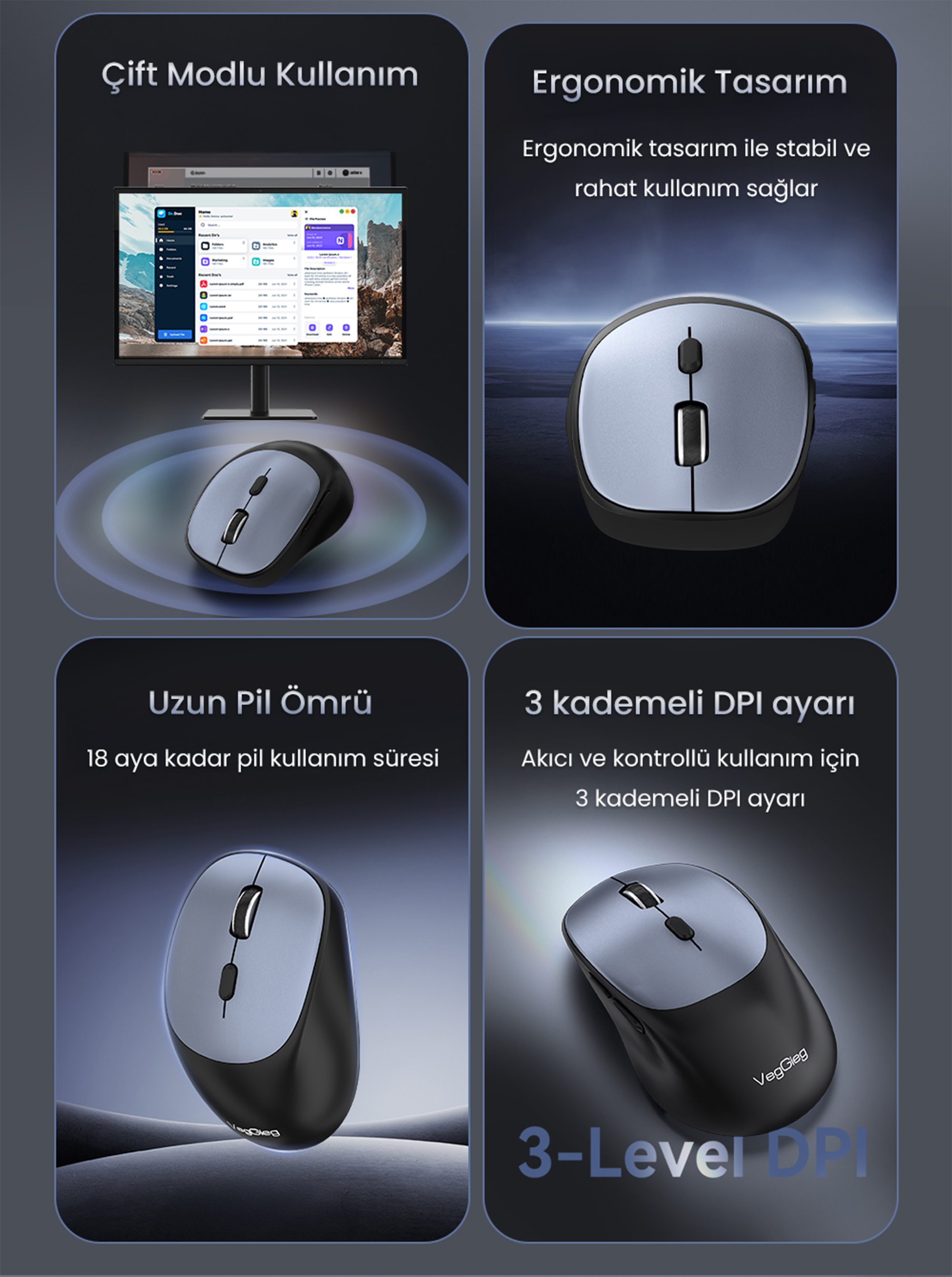 VegGieg G800 Ergonomik Kablosuz Mouse, ofis ve günlük bilgisayar kullanımı için tasarlanmış kablosuz bir mouse modelidir. Yüksek hassasiyetli optik algılama (high precision optics) sayesinde imleç hareketlerinde dengeli ve stabil bir kullanım sunar. Mouse, 2.4G kablosuz bağlantı teknolojisi ile çalışır ve 15 metreye kadar iletim mesafesi (long distance transmission) sunar. Bu sayede masaüstü, laptop ve ofis ortamlarında esnek kullanım sağlar. Tak-çalıştır (plug & play) yapısı sayesinde ek yazılım gerektirmeden hızlıca kullanılabilir.