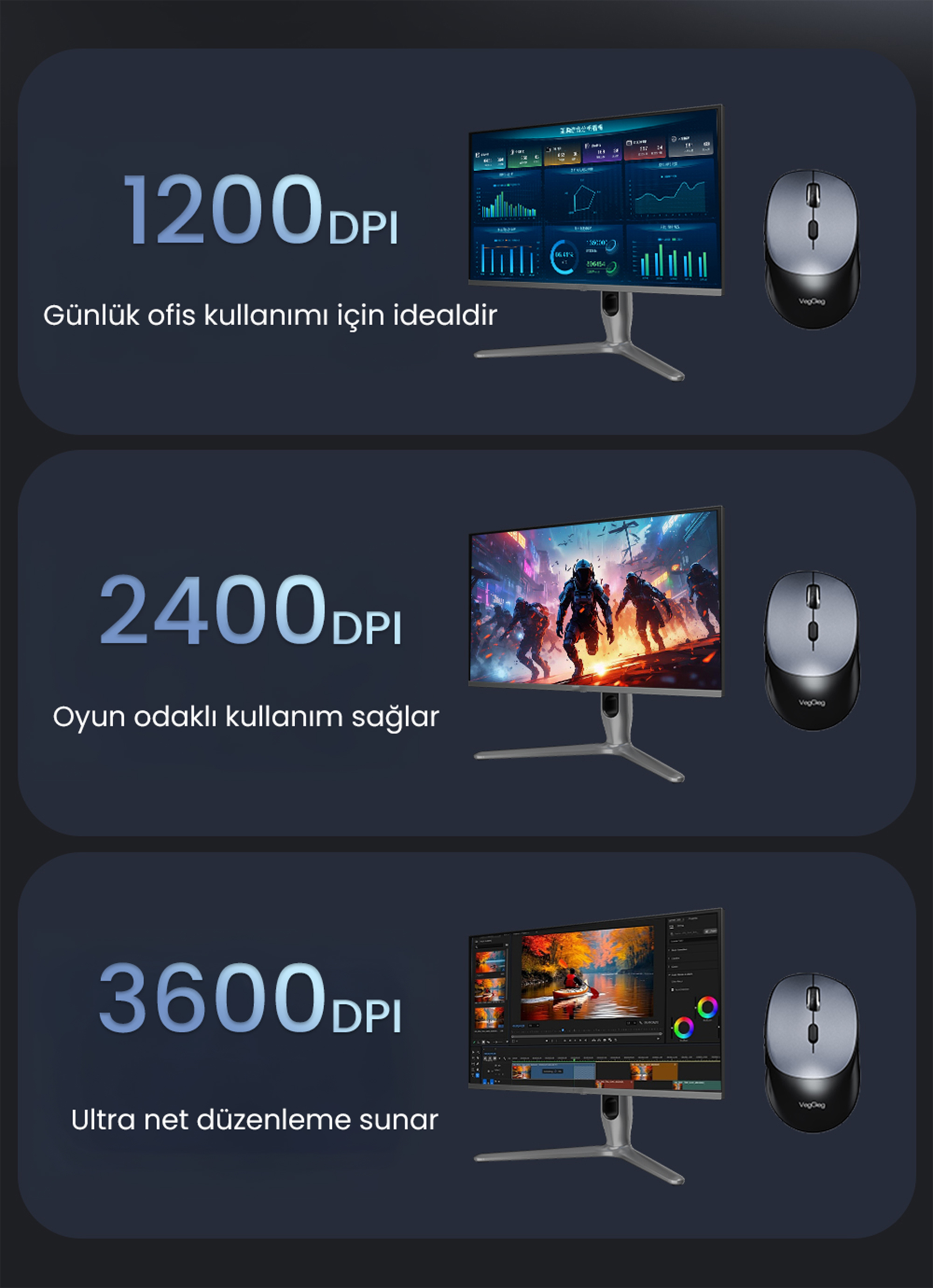 - DPI Ayarı: 3600 DPI'a kadar ayarlanabilir