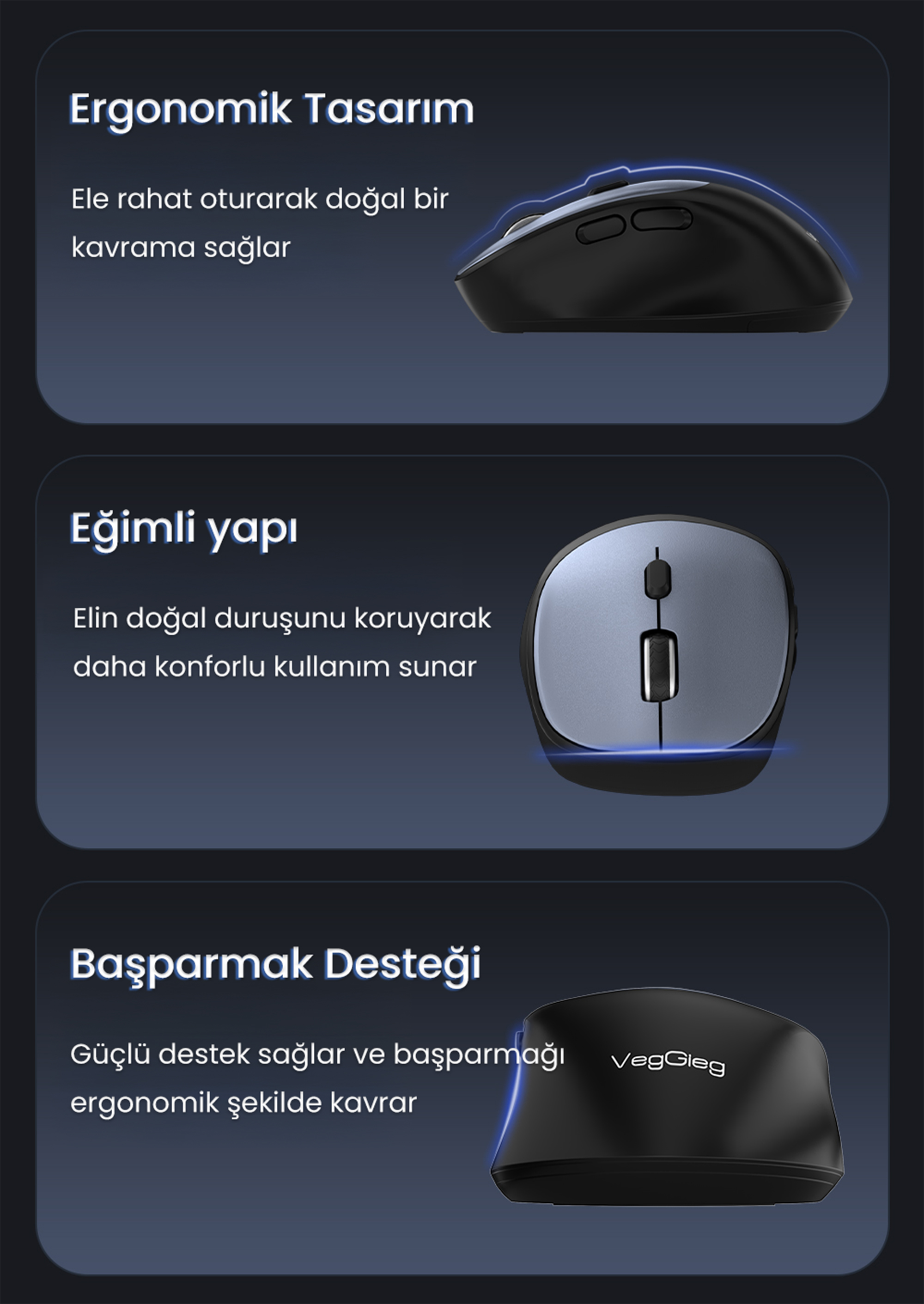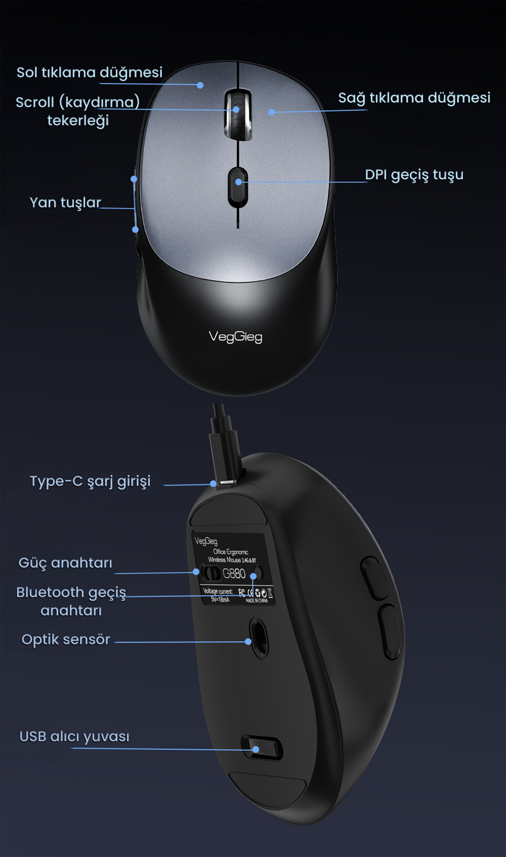 - 1 x VegGieg G880 Dual-Mode Bluetooth 5.3 ve 2.4GHz 3600DPI Optik Kablosuz Mouse
