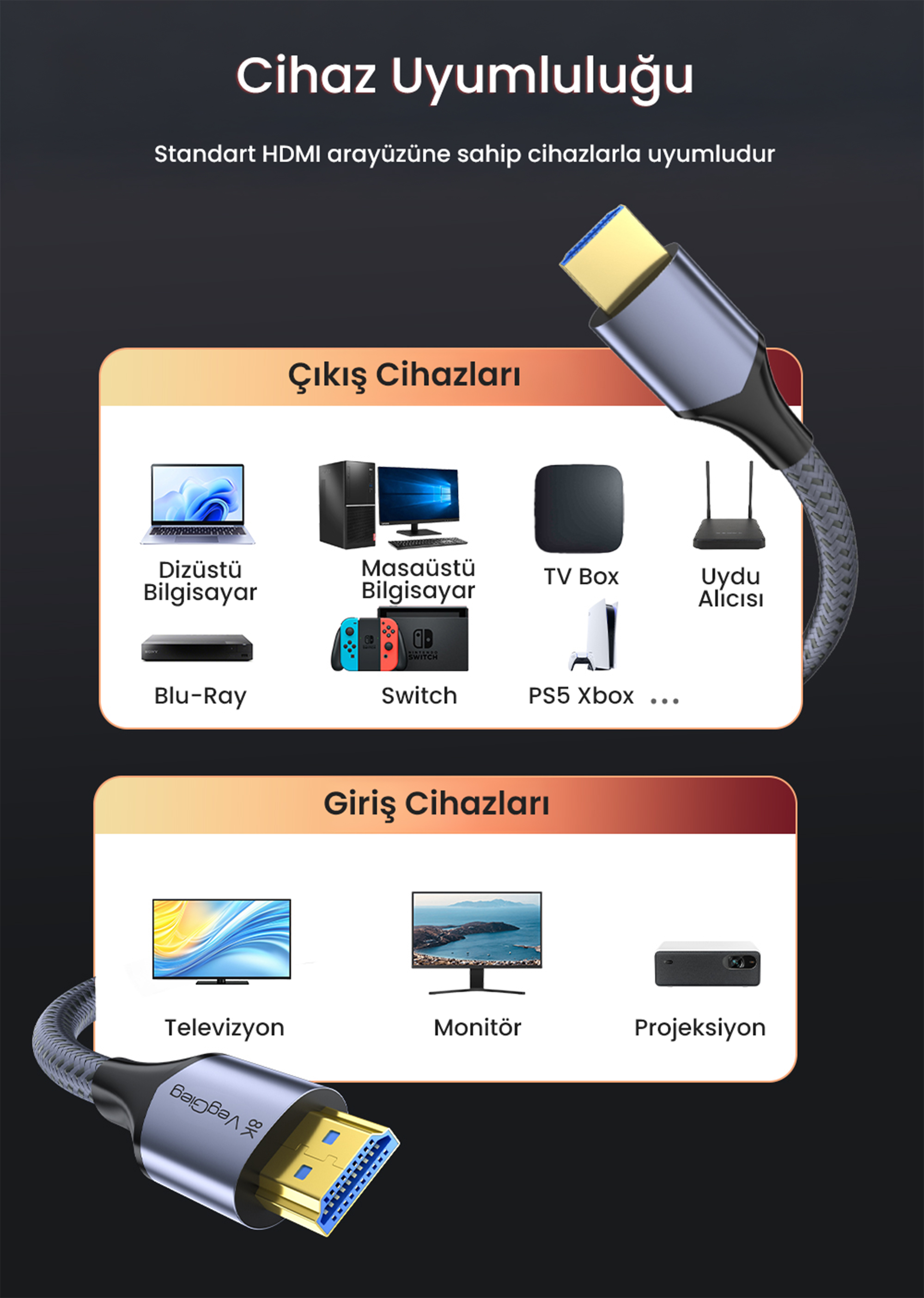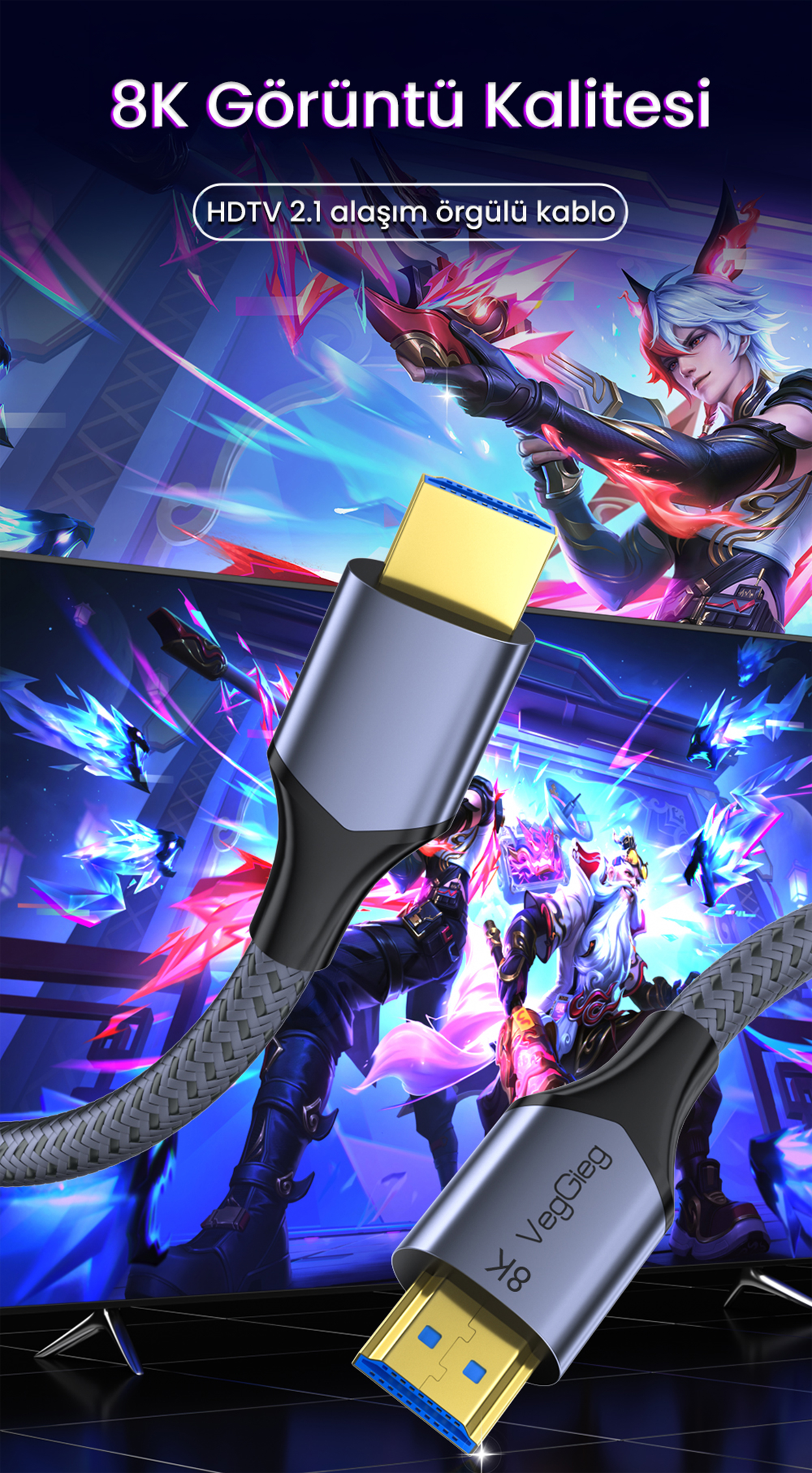 - 1 x VeGieg HDMI 2.1 8K 60Hz 4K 120Hz 48 Gbps HDR eARC HDCP 2.2 Örgülü Ses ve Görüntü Kablosu