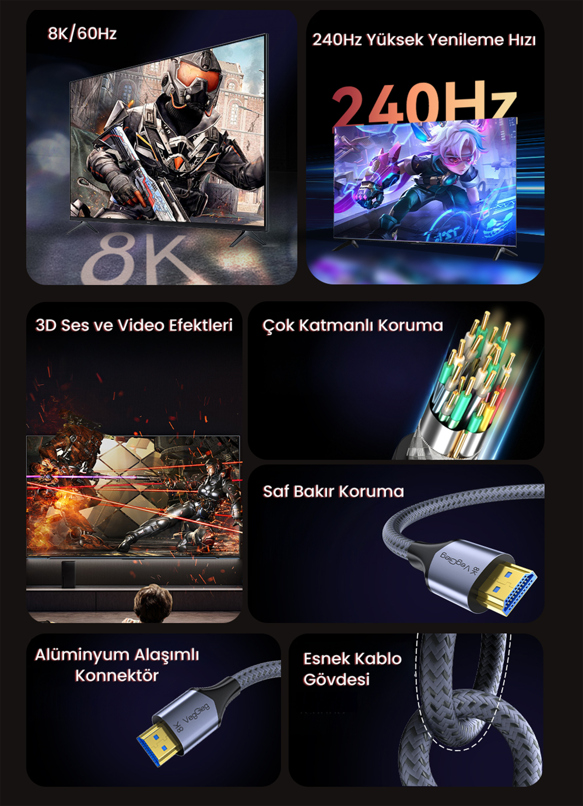 Kablo, 8K/60Hz ve 4K/120Hz çözünürlük desteği ile yüksek kare hızına sahip içeriklerde daha akıcı ve net görüntü sağlar. Özellikle hızlı sahneler, spor yayınları ve oyun deneyimlerinde görüntü kalitesinin korunmasına yardımcı olur.