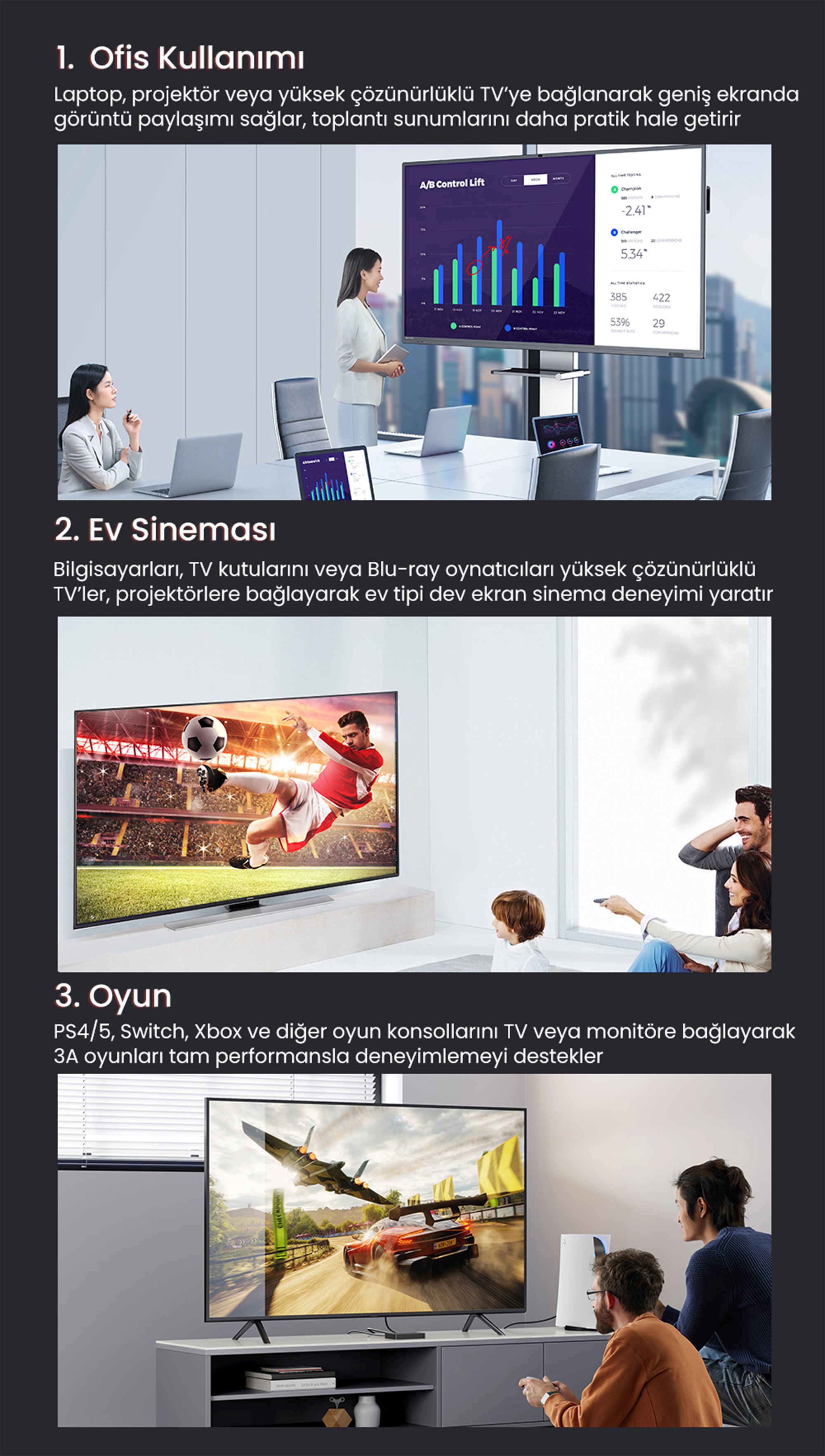 8K / 4K televizyonlar, Oyun konsolları (yeni nesil), Bilgisayar ve monitör sistemleri, Soundbar ve AV receiver bağlantıları, Ev sinema sistemleri