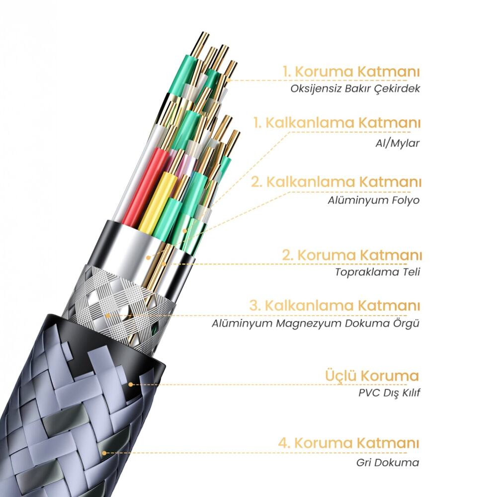Grey mesh (örgü) dış kaplama, kablonun fiziksel dayanıklılığını artırırken esnekliğini korur. Günlük kullanım, ev sinema sistemleri ve profesyonel multimedya kurulumları için uzun ömürlü bir yapı sunar.