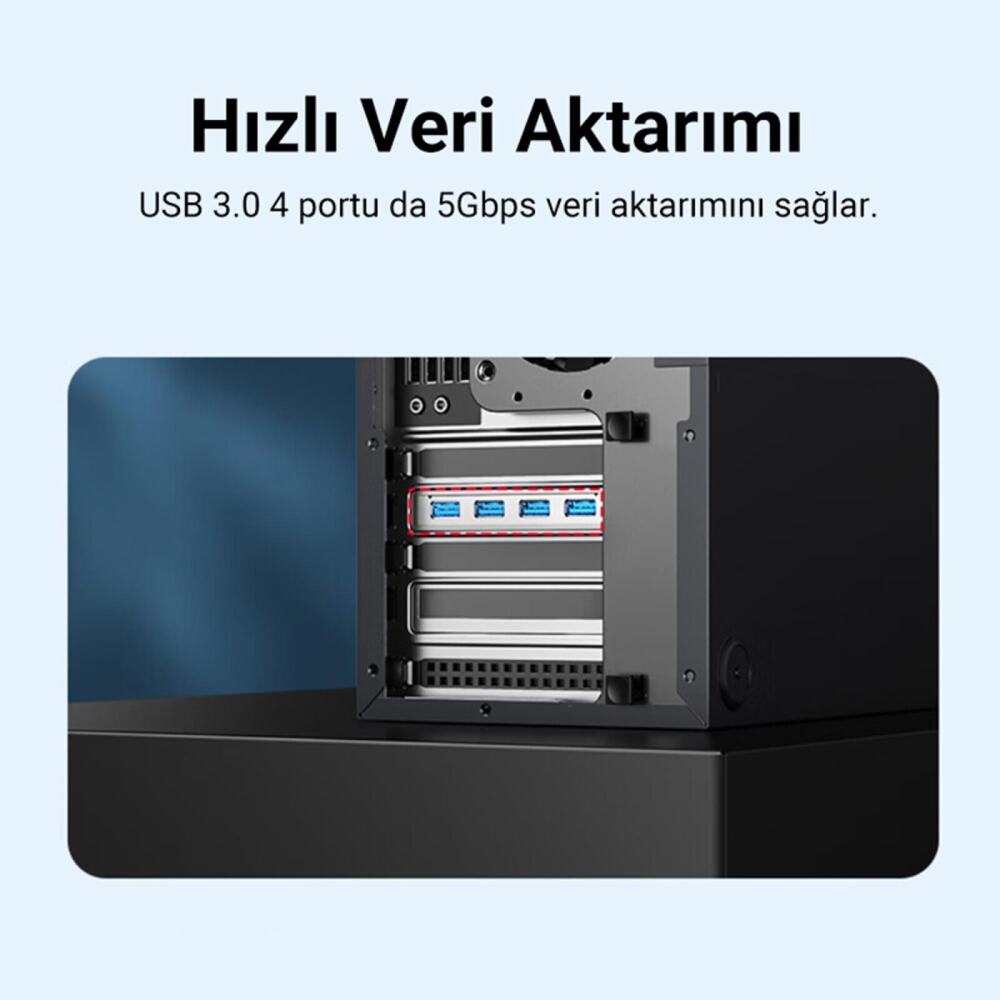 VegGieg PCI Express 1x 4 Portlu USB 3.0 Çoklayıcı Kart, masaüstü bilgisayarınızda yetersiz kalan hasar gören USB 3.0 bağlantı arayüzünü çoğaltabilir ve yüksek aktarım hızlarında kullanabilirsiniz. PCI Express 1x yuvasından 4 adet USB 3.0 bağlantı noktası sunarak, birden fazla cihazı aynı anda bağlama imkânı tanır. Yazıcı, harici hard disk, flash bellek ve diğer USB cihazlarınızı kolayca kullanabilirsiniz. 5 Gbps’ye kadar veri aktarım hızı sayesinde dosyalarınızı saniyeler içinde aktarabilirsiniz. Windows, MacOS, Linux gibi işletim sistemleriyle uyumludur.