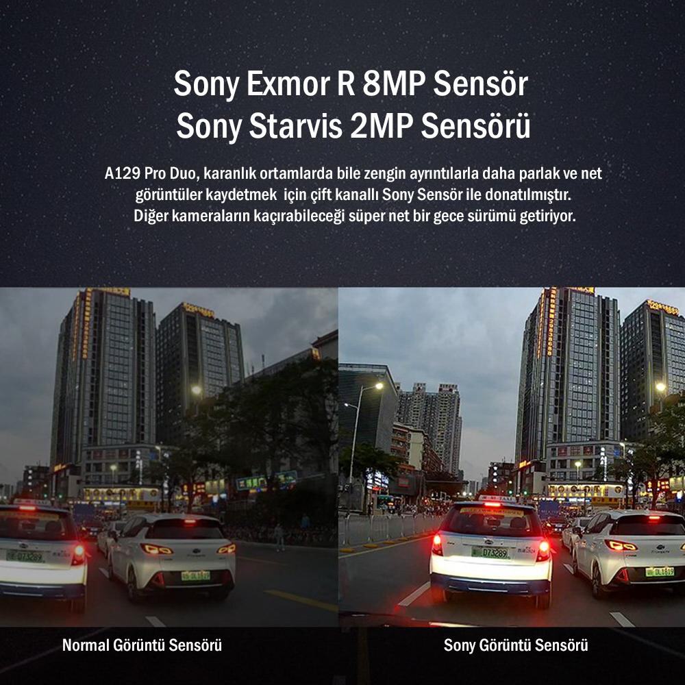 Viofo A129 Pro Duo 4K GPS'li akıllı araç kamerası, 4K ön kamera 1080P arka kamera ile üstün kaliteli Sony IMX317 8MP sensörü ile hem gündüz hemde gece boyu ultra yüksek çözünürlükte 4K video kaydetmektedir. Önde ve arkada bulunan kameralar sayesinde 130 ° geniş açıda görüntü kaydederek hiçbir ayrıntıyı kaçırmadan kör noktaları azaltarak sizi ve aracınızı doğacak olumsuzluklara karşı korur.A129 pro duo, karanlık ortamlarda bile kaliteli ayrıntılarla daha parlak ve net görüntü sağlamak için Sony Sensör ile donatılmıştır. Tamponlu park modu özelliği ile kamera, çevresindeki hareketleri algılayarak 45 saniyeye kadar görüntü kaydı sağlar. Dahili 2,4GHz ve 5GHz çift bantlı Wi-Fi desteği sayesinde 8 MB/sn'ye kadar veri aktarım hızına ulaşmaktadır. Cihazın aşırı sıcaklıktan korunması için dahili sensör bulunmaktadır. Bu sayede çalışma sıcaklığı belli bir dereceye ulaştığında kameranın aşırı ısınmasını önlemek için cihaz otomatik olarak kapanır. Viofo uygulaması, hem iOS hem de Android sistemlerini destekleyerek UHD video görüntülememizi veya indirmemizi sağlar.