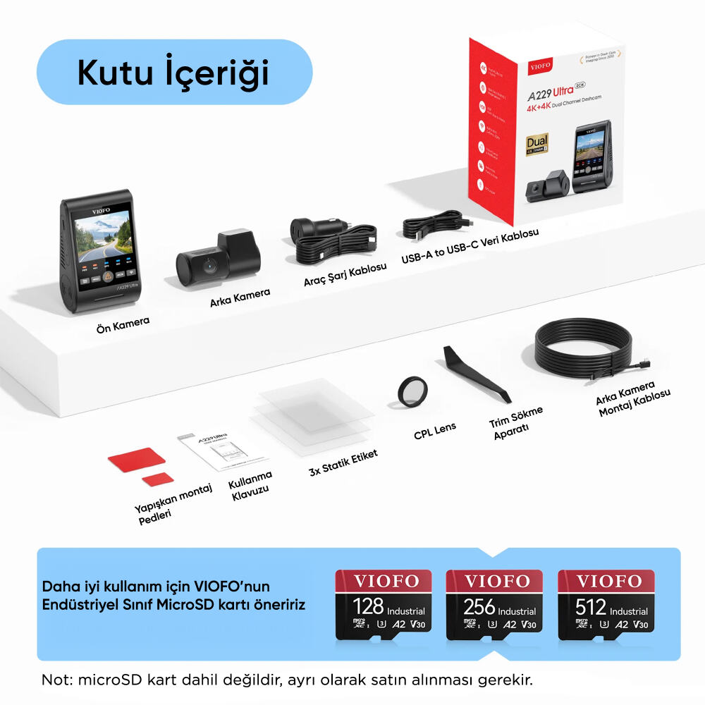 VIOFO A229 Ultra, 512GB'a kadar microSD kart destekler ve -20°C ile +65°C arasındaki sıcaklıklarda çalışabilir. Hem 2.4GHz hem de 5GHz Wi-Fi bağlantısını destekler, bu da çok daha hızlı dosya transferi sağlar.